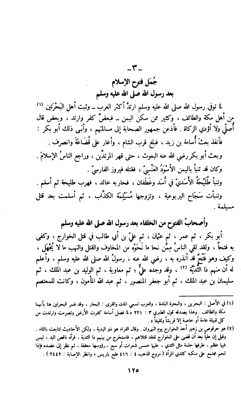 أبو بكر، ثم عمر، ثم عثمان، ثم عليّ بن أبي طالب في قتل الخوارج، وكفى به فتحاً، ولقد لقي الناسُ مِمَّن نحا ما نحوه من المخاوف والقتل والنهب ما لا يُجْهَل، وكيف هو فتحٌ قد أنذره به، رضي الله عنه، رسول الله صلى الله عليه وسلم، وأعلم له أن منهم ذا الثُّدَيَّة (2) ، وقد وجده عليٌّ؛ ثم معاوية، ثم الوليد بن عبد الملك، ثم سليمان بن عبد الملك، ثم أبو جعفر المنصور، ثم عبد الله المأمون، وكانت للمعتصم