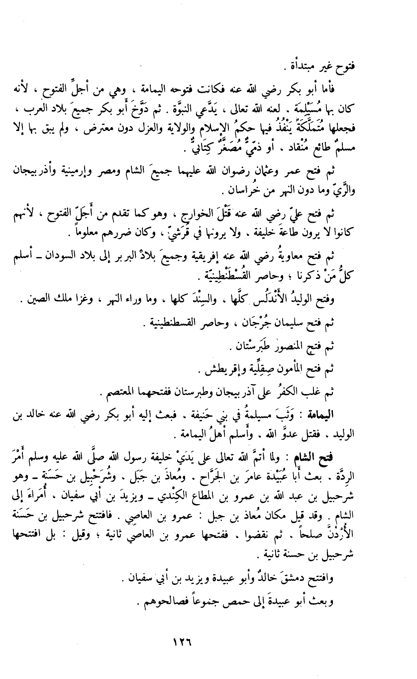 فأما أبو بكر رضي الله عنه فكانت فتوجه اليمامة، وهي من أجل الفتوح، لأنه كان بها مُسَيلمة، لعنه الله تعالى، يَدَّعي النبوَّة. ثم دَوَّخَ أبو بكر جميع بلاد العرب، فجعلها مُتملكة ينفذُ فيها حكم الإسلام والولاية والعزل دون معترض، ولم يبق بها إلا مسلمٌ طائع مُنْقاد، أو ذمّيٌّ مُصَغَّرٌ كِتَابيٌّ.