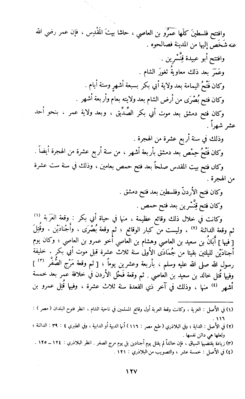 وكانت من خلال ذلك وقائع عظيمة، منها في حياة أبي بكر: وقعة العَرَبة (1) ثم وقعة الداثنة (2) ، وليست من كبار الوقائع؛ ثم وقعة بُصْرَى، وأَجْنادين، وقُتِلَ [فيها] أَبَانُ بن سعيد بن العاصي وهشام بن العاصي أخو عمرو بن العاصي؛ وكان يوم أجنادَيْن لليلتين بقيتا من جُمَادَى الأولى ثلاث عشرة قبل موت أبي بكر، خليفة رسول الله صلى الله عليه وسلم، بأربعة وعشرين يوماً؛ [ثم وقعة مَرْج الصُّفَّر (3) ] وفيها قُتل خالد بن سعيد بن العاصي. ثم وقعة فَحْل الأردن في خلافة عمر بعد خمسة أشهر (4) منها، وذلك في آخر ذي القعدة سنة ثلاث عشرة، وفيها قُتِل عمرو بن