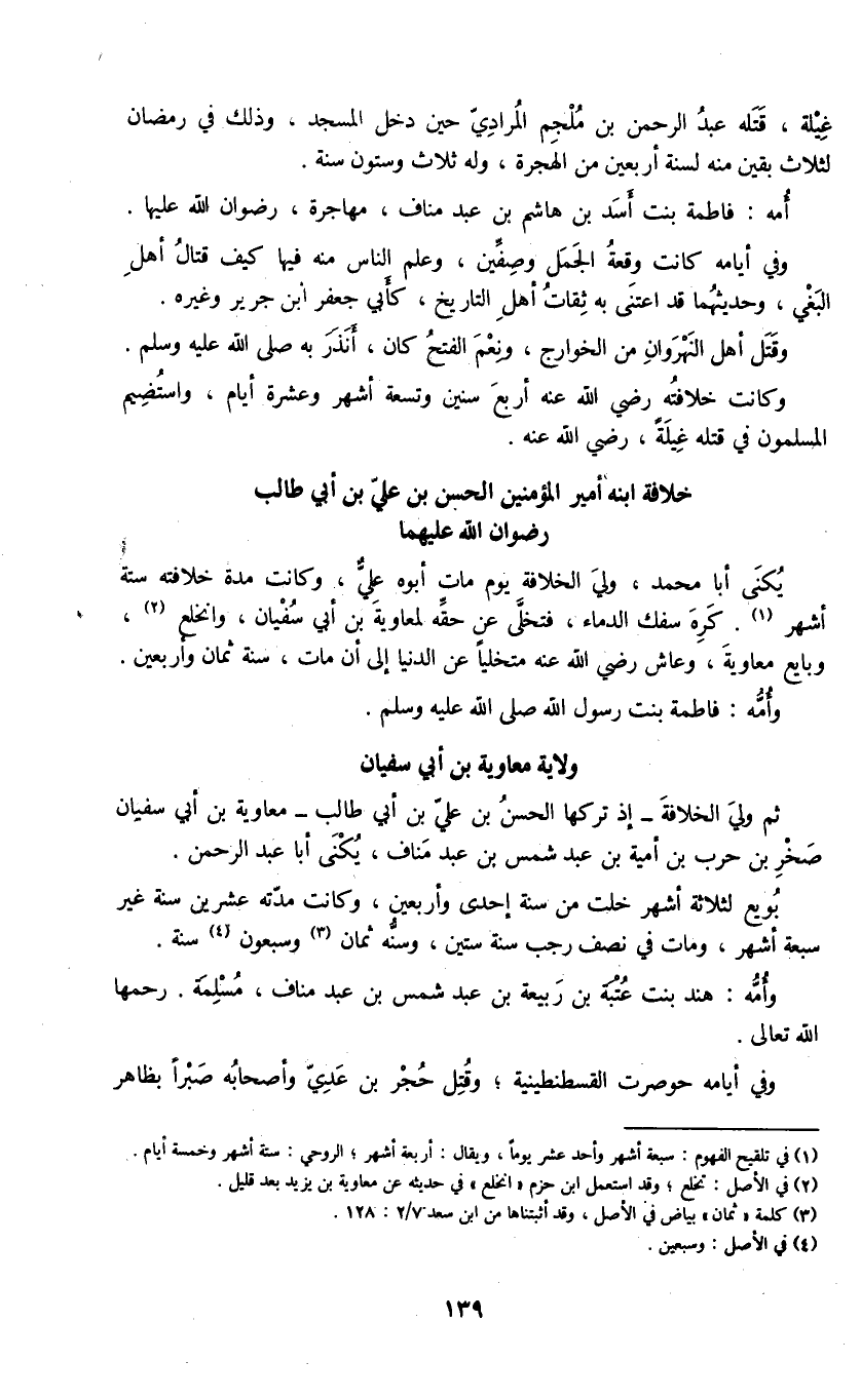 ثم وليَ الخلافةَ - إذ تركها الحسنُ بن عليّ بن أبي طالب - معاوية بن أبي سفيان صَخْرِ بن حرب بن أمية بن عبد شمس بن عبد مناف، يُكْنَى أبا عبد الرحمن.