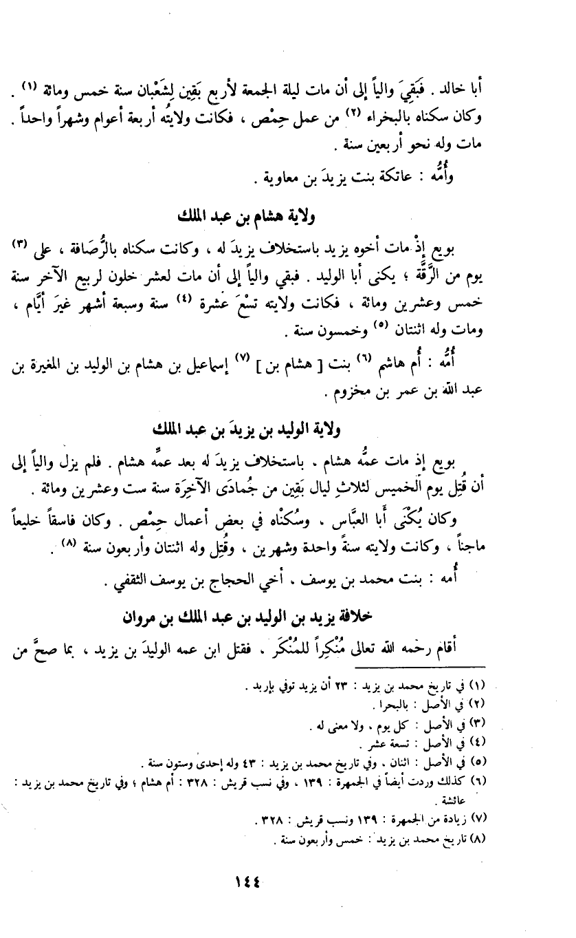 بويع إذ مات أخوه يزيد باستخلاف يزيد له، وكانت سكناه بالرصافة، على (3) يوم من الرقة؛ يكنى أبا الوليد. فبقي والياً إلى أن مات لعشر خلون لربيع الآخر سنة خمس وعشرين ومائة، فكانت ولايته تسع عشرة (4) سنة وسبعة أشهر غير أيام، ومات وله اثتان (5) وخمسون سنة.
