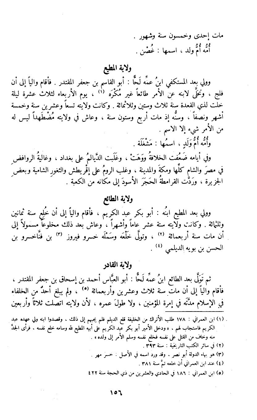 وولي بعد المطيع ابنه: أبو بكر عبد الكريم، فأقام والياً إلى أن خلع سة ثمانين وثلثمائة. وكانت ولايته ستة عشر عاماً وأشهراً، وعاش بعد ذلك مخلوعاً مسمولاً إلى أن مات سنة أربعمائة (2) ، وتولى خلعه وسَمْلَه خسرو فيروز (3) بن فناخسرو بن الحسن بن بويه الديلمي (4) .