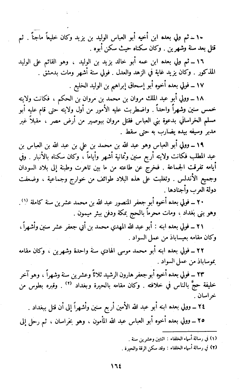 23 - فولي بعده أخوه أبو جعفر هارون الرشيد ثلاثاً وعشرين سنة وشهراً، وهو آخر خليفة حجَّ بالناس في خلافته. وكان مقامه بالحيرة وبغداد (2) . وقبره بطوس من خراسان.