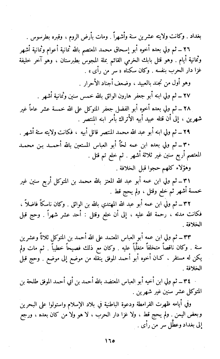 31 - ثم ولي ابن عمه أبو عبد الله المعتز بالله محمد بن المتوكل أربع سنين غير خمسة أشهر ثم خلع وقتل، ولم يحج قط.
