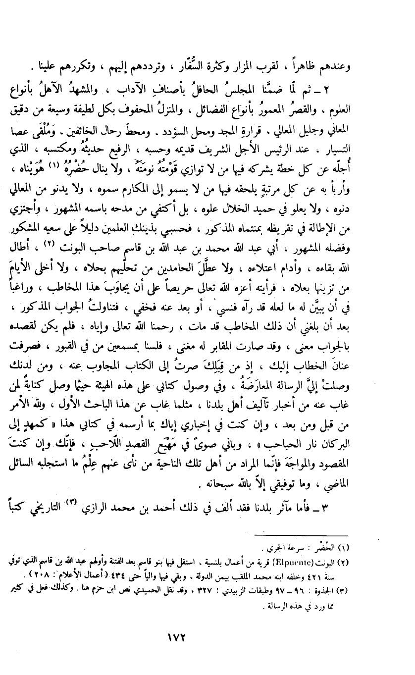 3 - فأما مآثر بلدنا فقد ألف في ذلك أحمد بن محمد الرازي (3) التاريخي كتباً