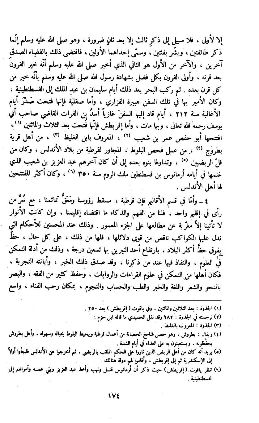 إلا لأولى، فلا سبيل إلى ذكر ثالث بعد ثان ضرورة، وهو صلى الله عليه وسلم إنما ذكر طائفتين، وبشر بفئتين، وسمّى إحداهما الأولين، فاقتضى ذلك بالقضاء الصدق آخرين، والآخر من الأول هو الثاني الذي أخبر صلى الله عليه وسلم أنه خير القرون بعد قرنه، وأول القرون بكل فضل بشهادة رسول الله صلى الله عليه وسلم بأنه خير من كل قرن بعده. ثم ركب البحر بعد ذلك أيام سليمان بن عبد الملك إلى القسطنطينية، وكان الأمير بها في تلك السفن هبيرة الفزاري، وأما صقلية فإنها فتحت صدر أيام الأغالبة سنة 212، أيام قاد إليها السفن غازياً أسد بن الفرات القاضي صاحب أبي يوسف رحمه الله تعالى، وبها مات، وأما إقريطش فإنها فُتحت بعد الثلاث والمائتين (1) ، افتتحها أبو حفص عمر بن شعيب (2) ، المعروف بابن الغليظ (3) ، من أهل قرية بطروج (4) ، من عمل فحص البلوط، المجاور لقرطبة من بلاد الأندلس، وكان من فلّ الربضيين (5) ، وتداولها بنوه بعده إلى أن كان آخرهم عبد العزيز بن شعيب الذي غنمها في ايامه أرمانوس بن قسطنطين ملك الروم سنة 350 (6) ، وكان أكثر المفتتحين لها أهل الأندلس.