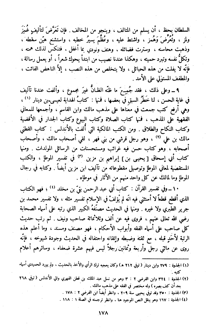 وفي تفسير القرآن: كتاب أبي عبد الرحمن بقي بن مخلد (4) ؛ فهو الكتاب الذي أقطع قطعاً لا أستثني فيه انه لم يؤلف في الإسلام تفسير مثله، ولا تفسير محمد بن جرير الطبري ولا غيره. ومنها في الحديث مصنفه الكبير الذي رتبه على أسماء الصحابة رضي الله تعالى عنهم، فروى فيه عن ألف وثلاثمائة صاحب ونيف. ثم رتب حديث كل صاحب على أسماء الفقه وأبواب الأحكام، فهو مصنف ومسند، وما أعلم هذه الرتبة لأحدٍ قبله، مع ثقته وضبطه وإتقانه واحتفاله في الحديث وجودة شيوخه، فإنه روى عن مائتي رجل وأربعة وثمانين رجلاً ليس فيهم عشرة ضعفاء، وسائرهم أعلام