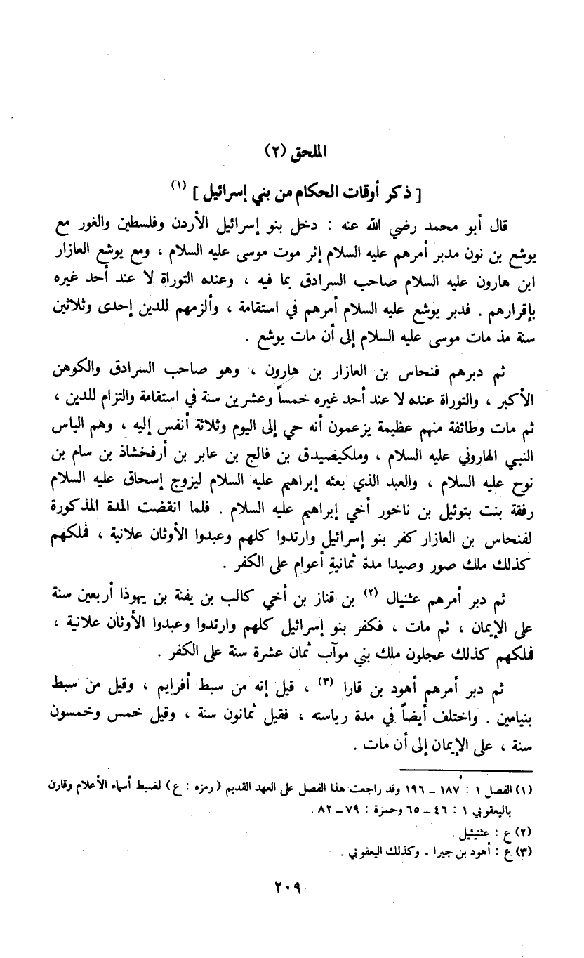 (1) الفصل 1: 187 - 196 وقد راجعت هذا الفصل على العهد القديم (رمزه: ع) لضبط أسماء الأعلام وقارن باليعقوبي 1: 46 - 65 وحمزة: 79 - 82.
