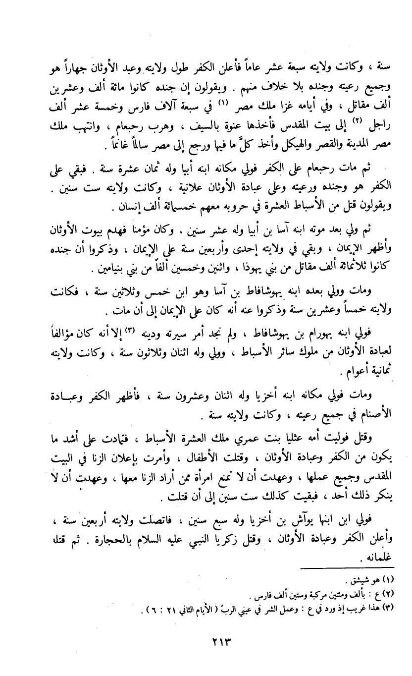 سنة، وكانت ولايته سبعة عشر عاماً فأعلن الكفر طول ولايته وعبد الأوثان جهاراً هو وجميع رعيته وجنده بلا خلاف منهم. ويقولون إن جنده كانوا مائة ألف وعشرين الف مقاتل، وفي ايامه غزا ملك مصر (1) في سبعة آلاف فارس وخمسة عشر ألف راجل (2) إلى بيت المقدس فأخذها عنوة بالسيف، وهرب رحبعام، وانتهب ملك مصر المدينة والقصر والهيكل وأخذ كل ما فيها ورجع إلى مصر سالماً غانماً.
