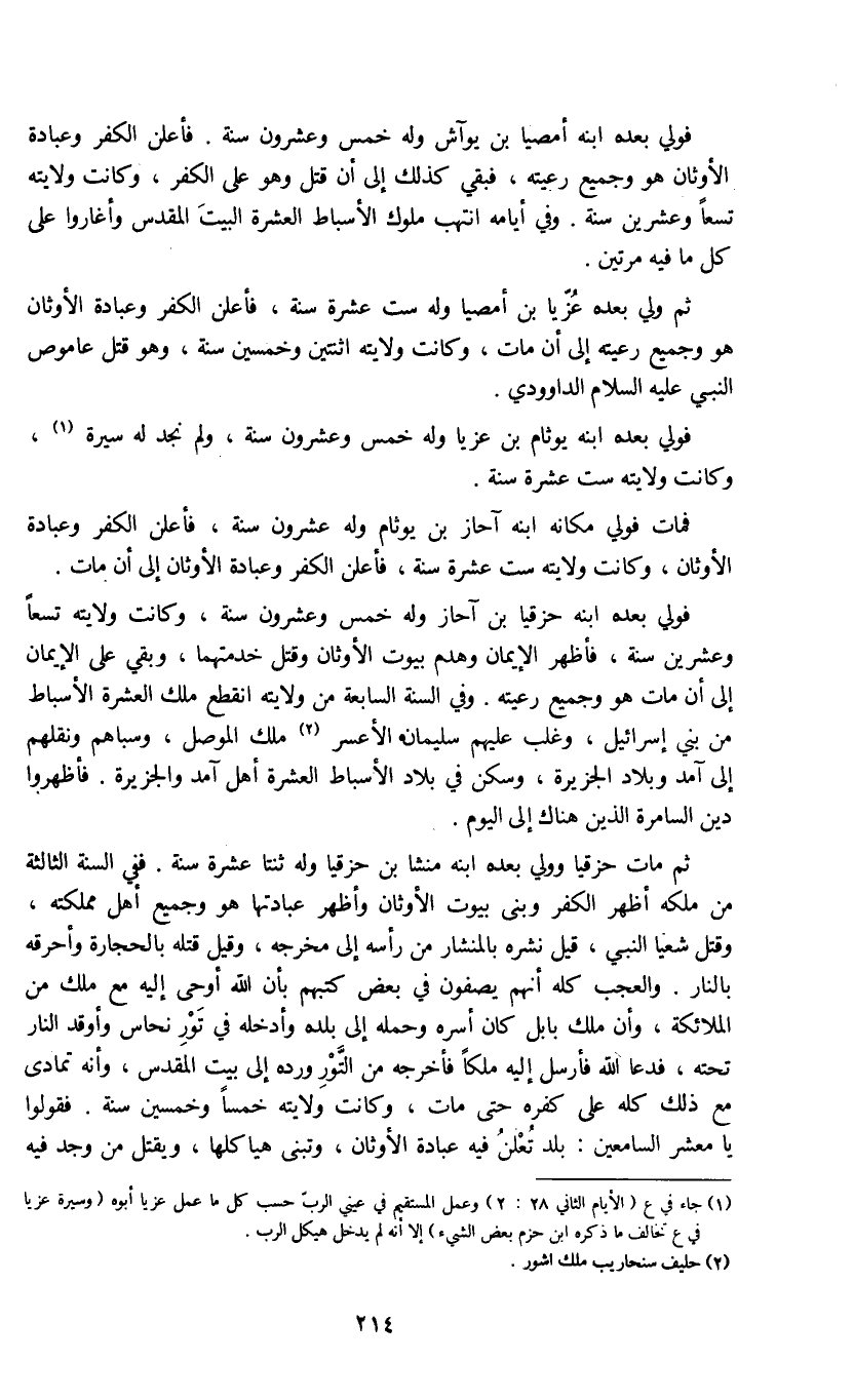 (1) جاء في ع (الأيام الثاني 28: 2) وعمل المستقيم في عيني الرب حسب كل ما عمل عزيا أبوه (وسيرة عزيا في ع تخالف ما ذكره ابن حزم بعض الشيء) إلا أنه لم يدخل هيكل الرب.