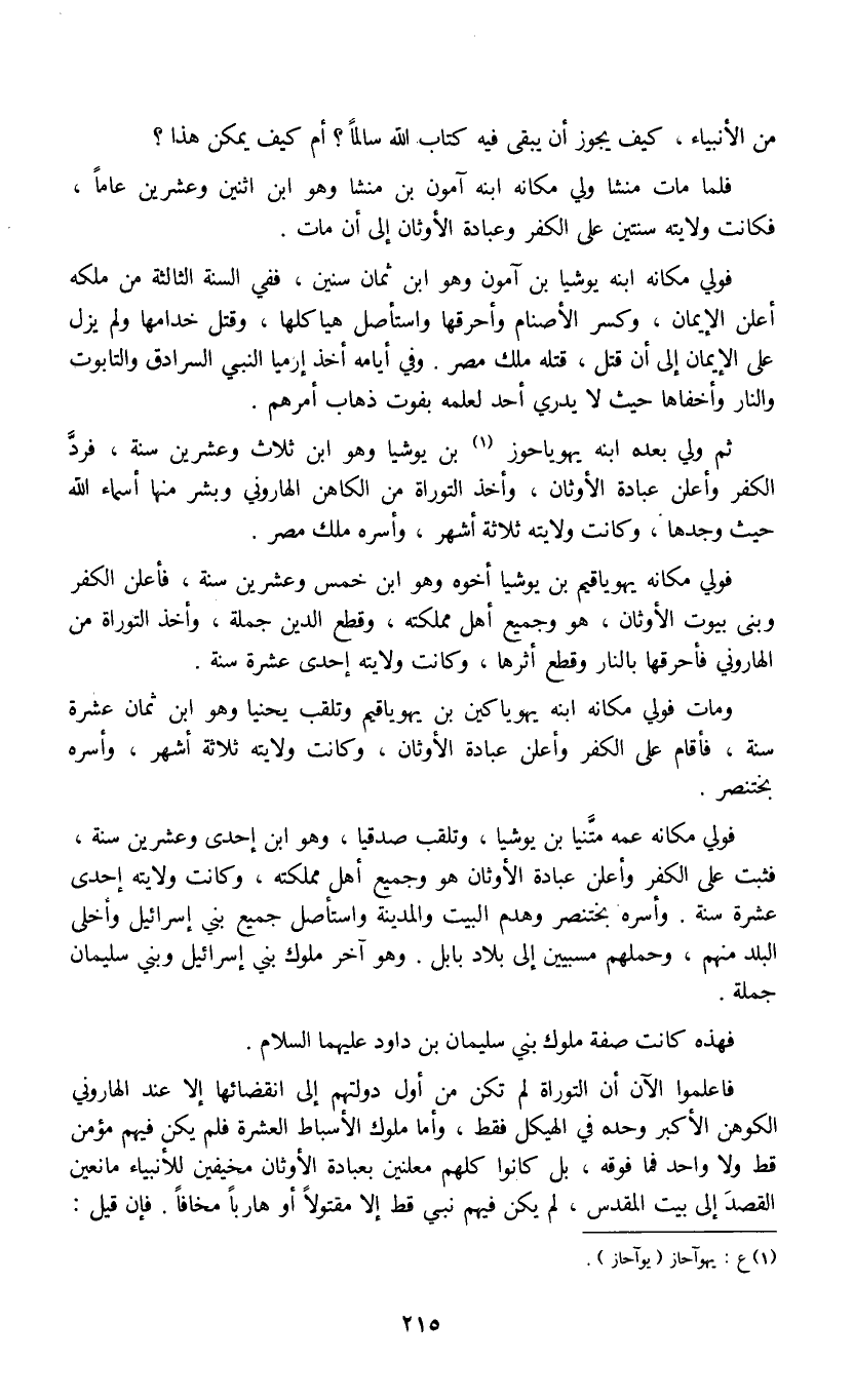 ثم ولي بعده ابنه يهوياحوز (1) بن يوشيا وهو ابن ثلاث وعشرين سنة، فرد الكفر وأعلن عبادة الأوثان، وأخذ التوراة من الكاهن الهاروني وبشر منها أسماء الله حيث وجدها، وكانت ولايته ثلاثة أشهر، وأسره ملك مصر.