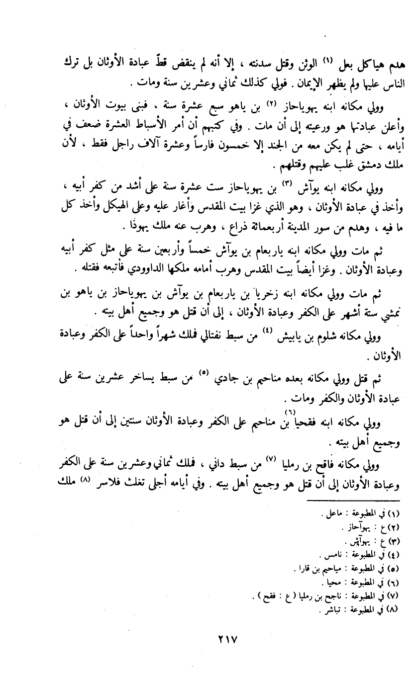 ثم قتل وولي مكانه بعده مناحيم بن جادي (5) من سبط يساخر عشرين سنة على عبادة الأوثان والكفر ومات.