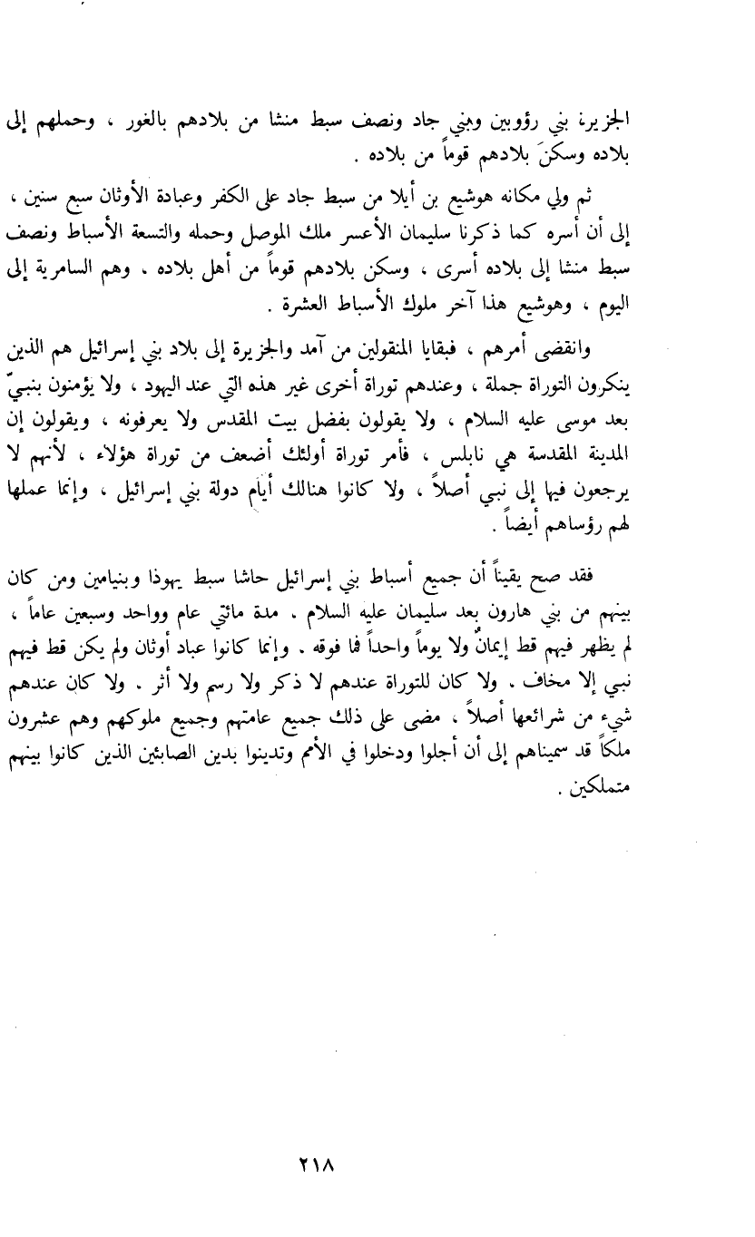 وانقضى أمرهم، فبقايا المنقولين من آمد والجزيرة إلى بلاد بني إسرائيل هم الذين ينكرون التوراة جملة، وعندهم توراة أخرى غير هذه التي عند اليهود، ولا يؤمنون بنبي بعد موسى عليه السلام، ولا يقولون بفضل بيت المقدس ولا يعرفونه، ويقولون إن المدينة المقدسة هي نابلس، فأمر توراة أولئك أضعف من توراة هؤلاء، لأنهم لا يرجعون فيها إلى نبي أصلاً، ولا كانوا هنالك أيام دولة بني إسرائيل، وإنما عملها لهم رؤساهم أيضاً.