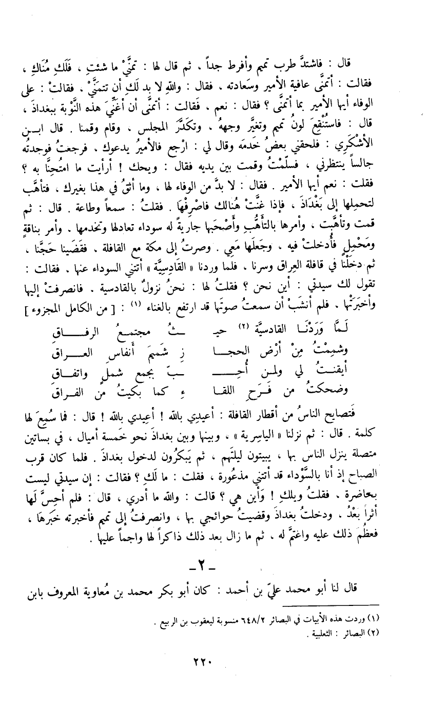 وضحكت من فرح اللقا ... ء كما بكيت من الفراق فتصايح الناس من أقطار القافلة: أعيدي بالله! قال: فما سمع لها كلمة. قال: ثم نزلنا " الياسرية "، وبينها وبين بغداذ نحو خمسة أميال، في بساتين متصلة ينزل الناس بها، يبيتون ليلتهم، ثم يبكرون لدخول بغداذ. فلما كان قرب الصباح إذ أنا بالسوداء قد أتتني مذعورة، فقلت: ما لك فقالت: إن سيدتي ليست بحاضرة، فقلت ويلك! وأين هي قالت: والله ما أدري، قال: فلم أحس لها أثراً بعد، ودخلت بغداذ وقضيت حوائجي بها، وانصرفت إلى تميم فأخبرته خبرها، فعظم ذلك عليه واغتم له، ثم ما زال بعد ذلك ذاكراً لها واجماً عليها.