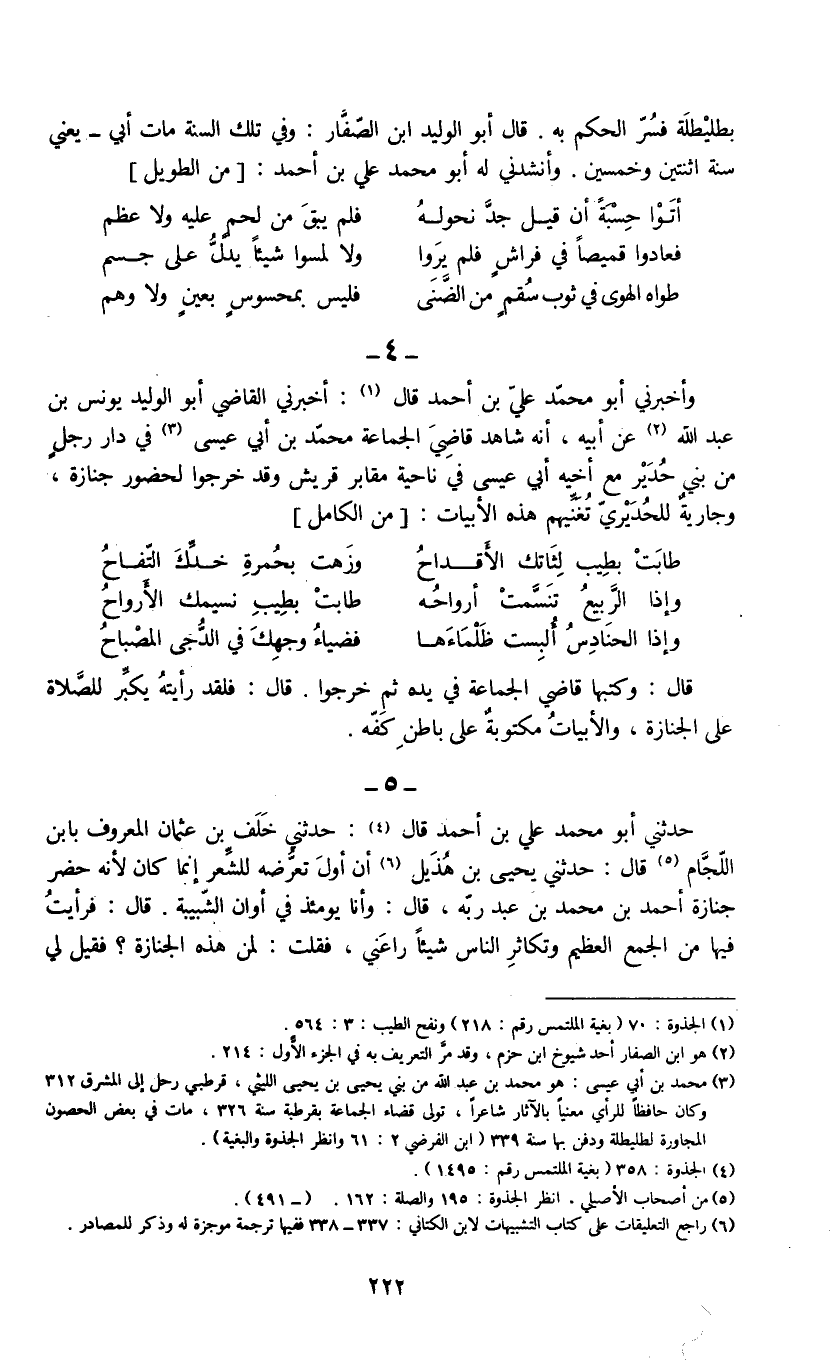 حدثني ابو محمد علي بن أحمد قال (4) : حدثني خلف بن عثمان المعروف بابن اللجام (5) قال: حدثني يحيى بن هذيل (6) أن أول تعرضه للشعر إنما كان لأنه حضر جنازة أحمد بن محمد بن عبد ربه، قال: وأنا يومئذ في أوان الشبيبة. قال: فرأيت فيها من الجمع العظيم وتكاثر الناس شيئاً راعني، فقلت: لمن هذه الجنازة فقيل لي
