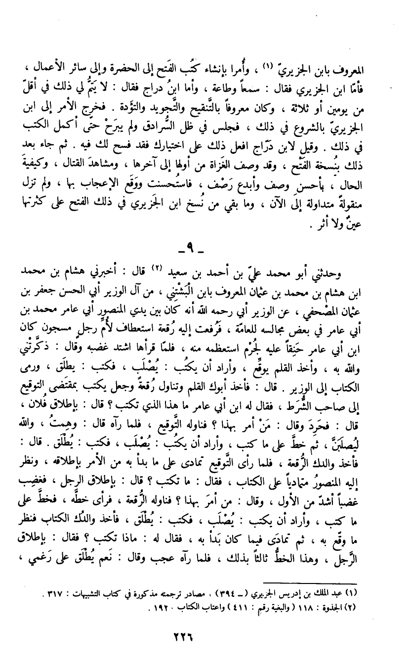 المعروف بابن الجزيري (1) ، وأُمرا بإنشاء كُتب الفتح إلى الحضرة وإلى سائر الأعمال، فأما ابن الجزيري فقال: سمعاً وطاعة، وأما ابن دراج فقال: لا يتم لي ذلك في أقل من يومين أو ثلاثة، وكان معروفاً بالتنقيح والتجويد والتؤدة. فخرج الأمر إلى ابن الجزيري بالشروع في ذلك، فجلس في ظل السُّرادق ولم يبرح حتى أكمل الكتب في ذلك. وقيل لابن دراج افعل ذلك على اختيارك فقد فسح لك فيه. ثم جاء بعد ذلك بنسخة الفتح، وقد وصف الغزاة من أولها إلى آخرها، ومشاهد القتال، وكيفية الحال، بأحسن وصف وأبدع رصف، فاستحسنت ووقع الإعجاب بها، ولم تزل منقولة متداولة إلى الآن، وما بقي من نسخ ابن الجزيري في ذلك الفتح على كثرتها عينٌ ولا أثر.