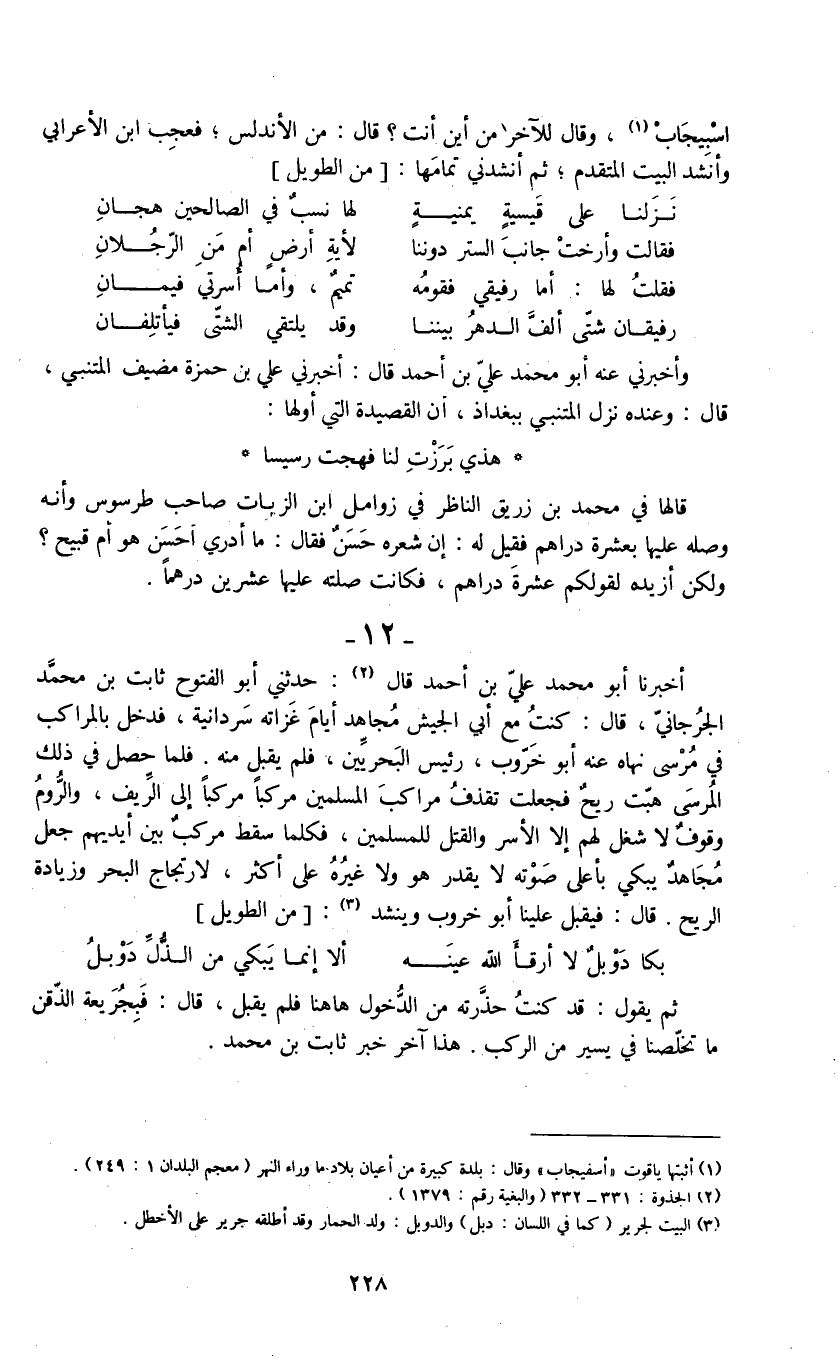 اسبيجاب (1) ، وقال للآخر من أين أنت قال: من الأندلس؛ فعجب ابن الأعرابي وأنشد البيت المتقدم؛ ثم أنشدني تمامها: [من الطويل]