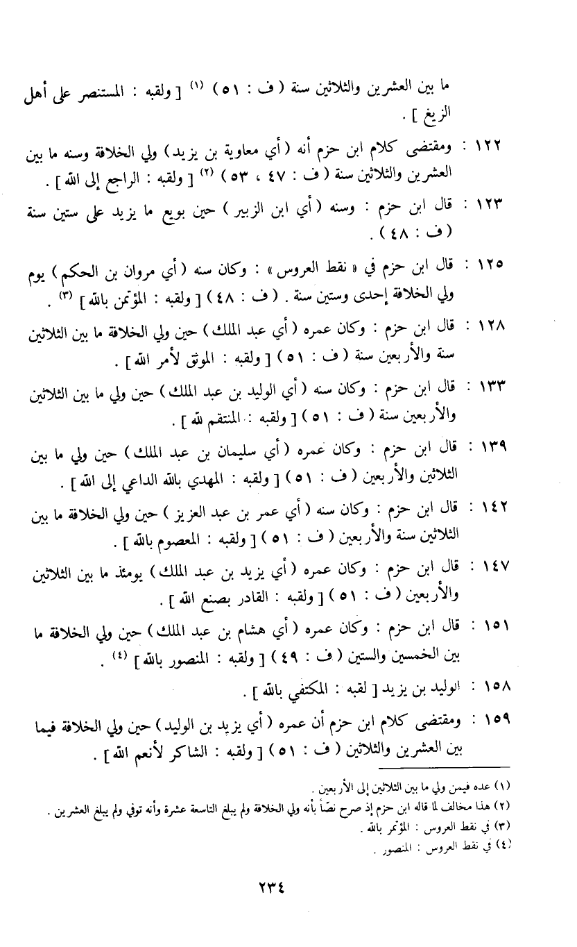 159: - ومقتضى كلام ابن حزم أن عمره (أي يزيد بن الوليد) حين ولي الخلافة فيما بين العشرين والثلاثين (ف: 51) [ولقبه: الشاكر لأنعم الله] .