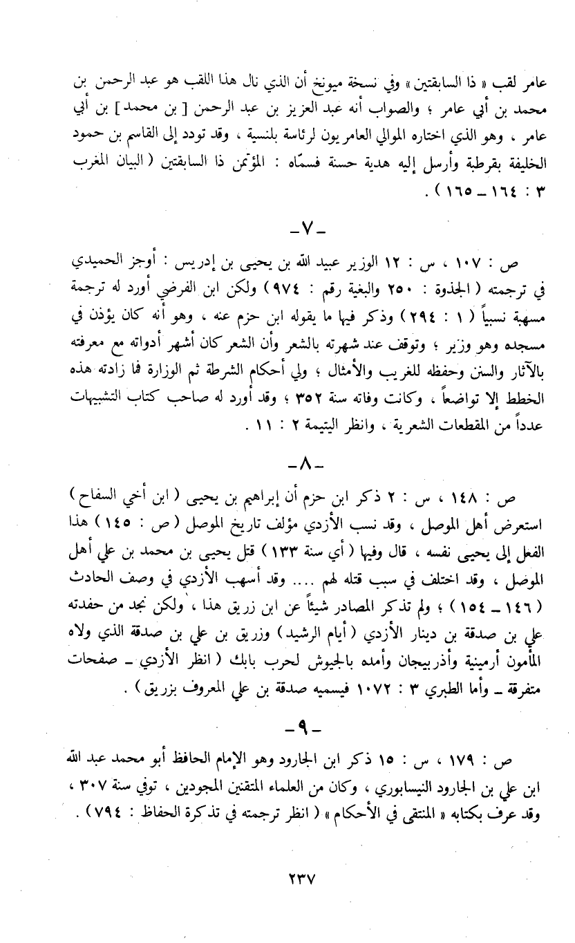 عامر لقب " ذا السابقتين " وفي نسخة ميونخ أن الذي نال هذا اللقب هو عبد الرحمن بن محمد بن أبي عامر؛ والصواب أنه عبد العزيز بن عبد الرحمن [بن محمد] بن أبي عامر، وهو الذي اختاره الموالي اعامريون لرئاسة بلنسية، وقد تودد إلى القاسم بن حمود الخليفة بقرطبة وارسل إليه هدية حسنة فسماه: المؤتمن ذا السابقتين (البيان المغرب 3: 164 - 165) .