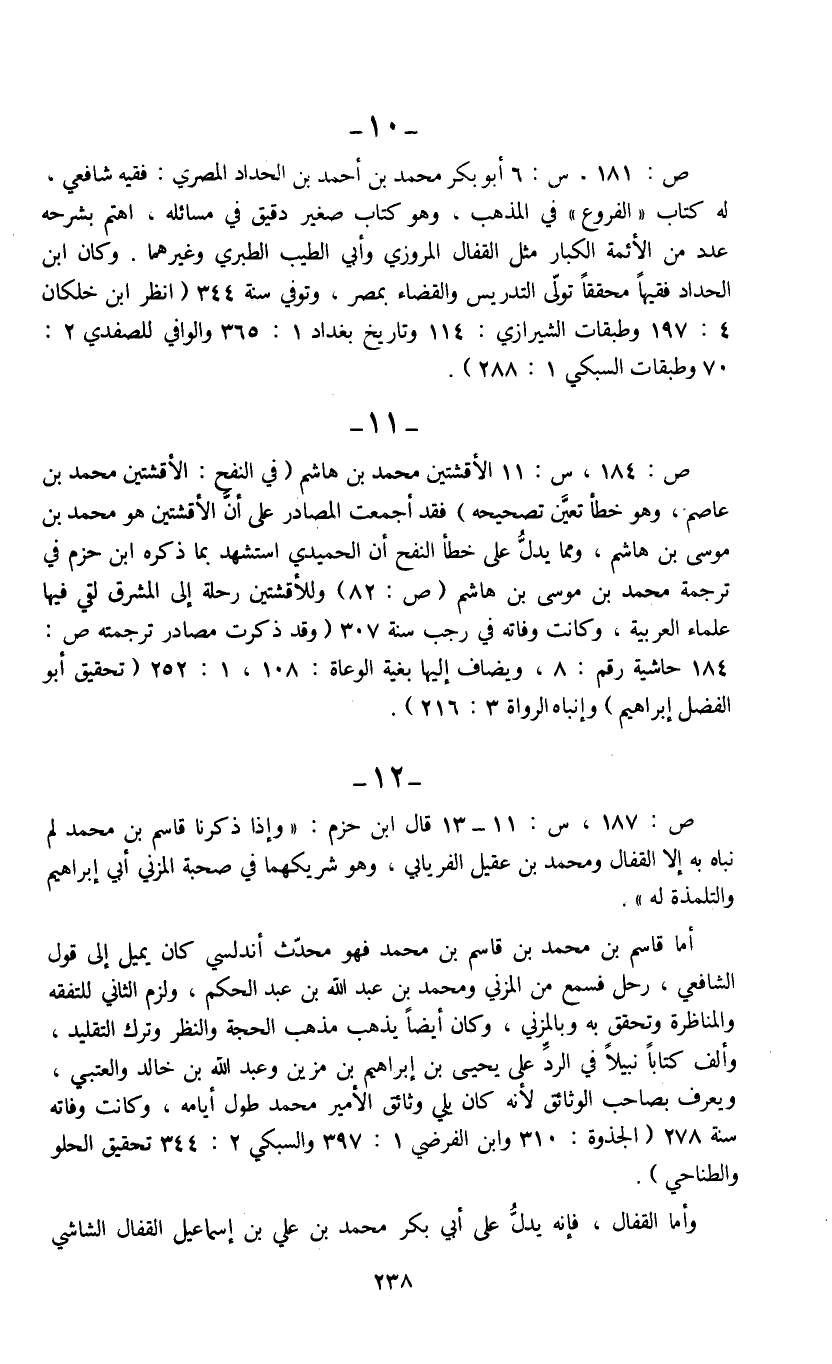ص: 181، س: 6 أبو بكر محمد بن أحمد بن الحداد المصري: فقيه شافعي، له كتاب " الفروع " في المذهب، وهو كتاب صغير دقيق في مسائله، اهتم بشرحه عدد من الأئمة الكبار مثل القفال المروزي وأبي الطيب الطبري وغيرهما. وكان ابن الحداد فقيهاً محققاً تولى التدريس والقضاء بمصر، وتوفي سنة 344 (انظر ابن خلكان 4: 197 وطبقات الشيرازي: 114 وتاريخ بغداد 1: 365 والوافي للصفدي 2: 70 وطبقات السبكي 1: 288) .