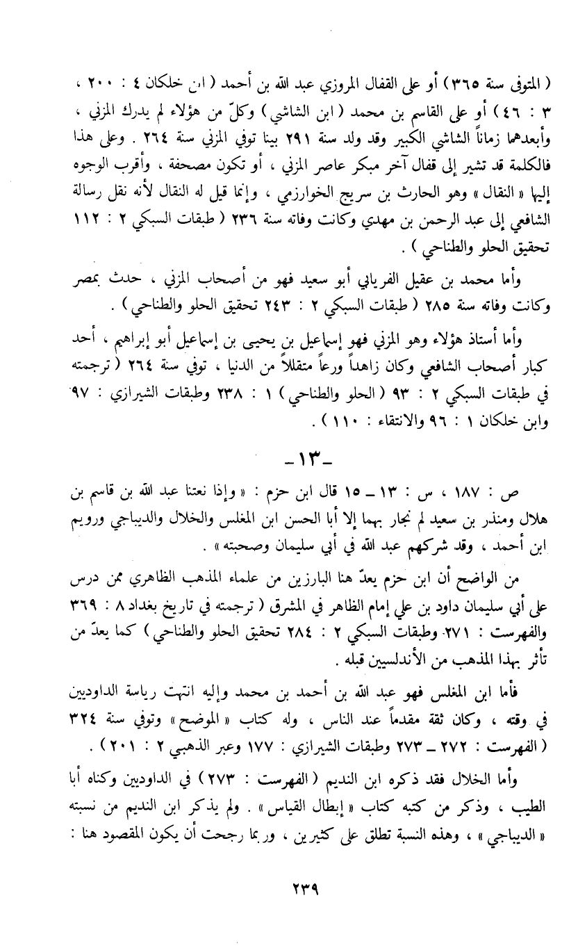 ص: 187، س: 13 - 15 قال ابن حزم: " وإذا نعتنا عبد الله بن قاسم بن هلال ومنذر بن سعيد لم نجار بهما إلا أبا الحسن ابن المغلس والخلال والديباجي ورويم ابن أحمد، وقد شركهم عبد الله في أبي سليمان وصحبته ".