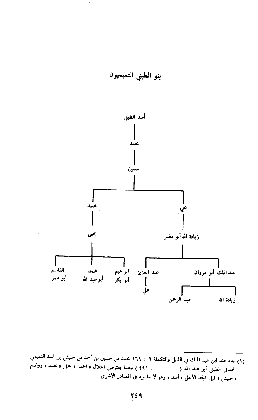 (1) جاء عند ابن عبد الملك في الذيل والتكملة 6: 169 محمد بن حسين بن أحمد بن حبيش بن أسد التميمي الحماني الطبني أبو عبد الله (- 491) وهذا يفترض احلال " أحمد " محل " محمد " ووضع " حبيش " قبل الجد الأعلى " أسد " وهو لا ما يرد في المصادر الأخرى.