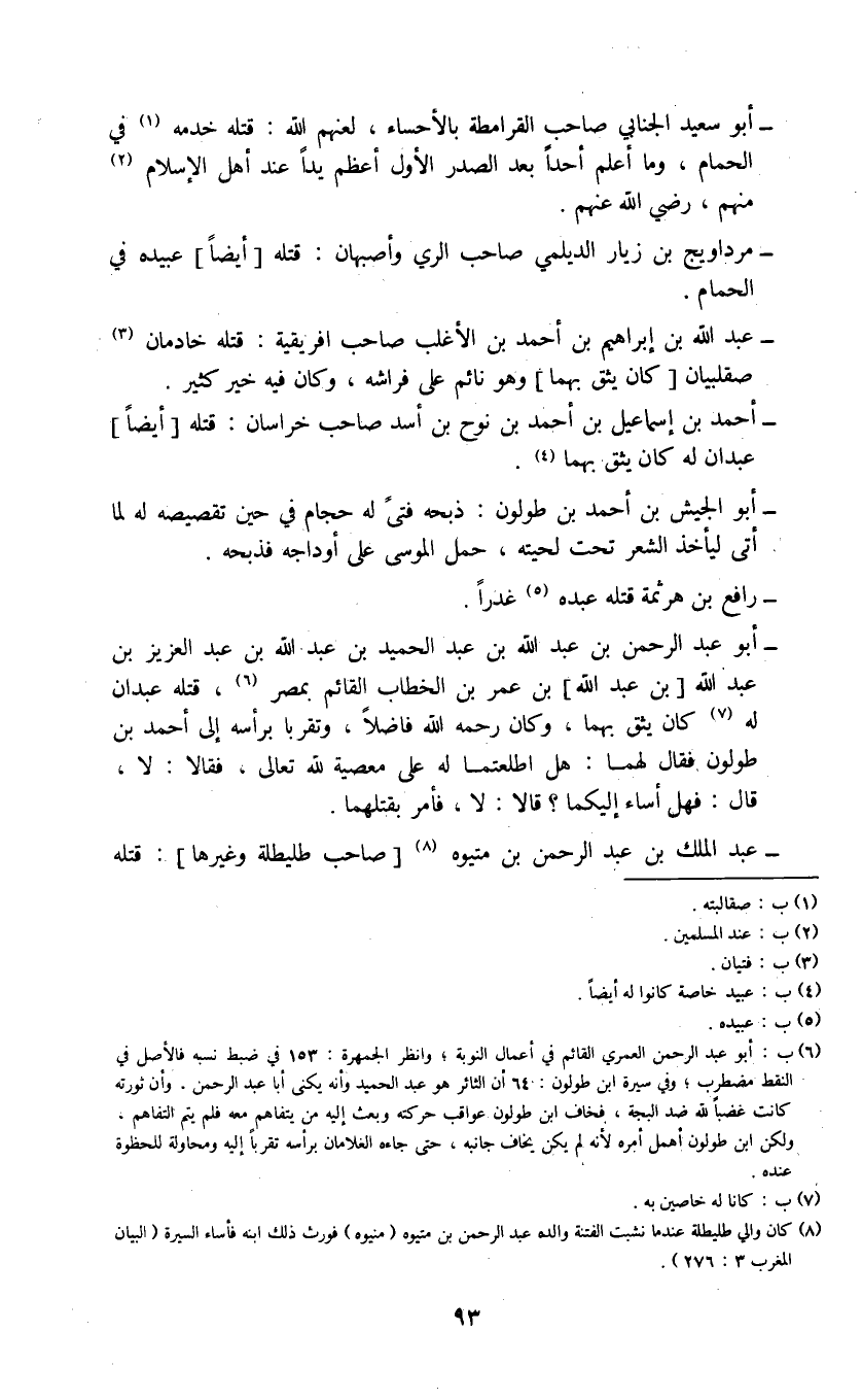 (6) ب: أبو عبد الرحمن العمري القائم في أعمال النوبة؛ وانظر الجمهرة: 153 في ضبط نسبه فالأصل في النقط مضطرب؛ وفي سيرة ابن طولون: 64 أن الثائر هو عبد الحميد وأنه يكنى أبا عبد الرحمن، وأن ثورته كانت غضباً لله ضد البجة، فخاف ابن طولون عواقب حركته وبعث إليه من يتفاهم معه فلم يتم التفاهم، ولكن ابن طولون أهمل أمره لأنه لم يكن يخاف جانبه، حتى جاءه الغلمان برأسه تقرباً إليه وماولة للحظوة عنده.