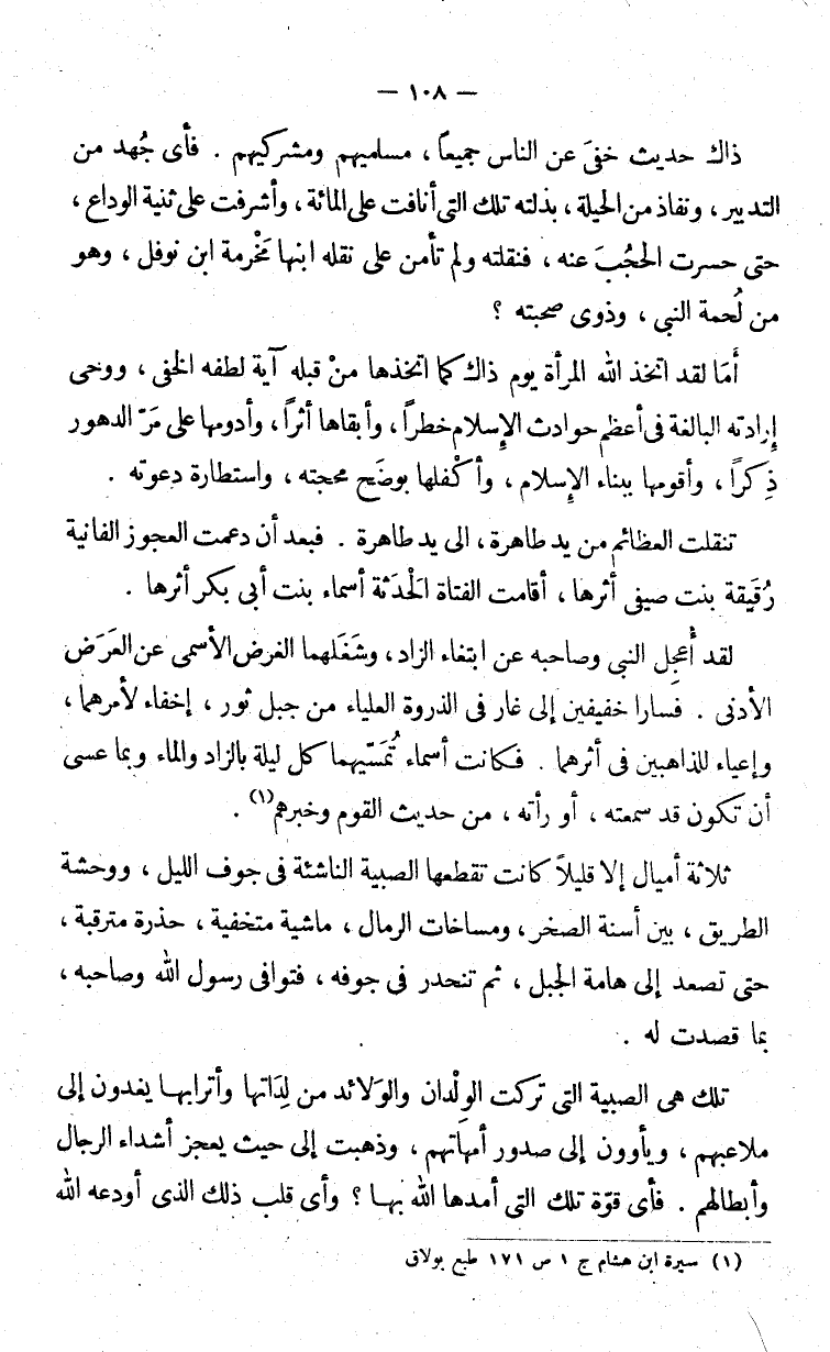 ثلاثة أميال إلا قليلا كانت تقطعها الصبية الناشئة في جوف الليل؛ ووحشة الطريق، بين أسنة الصخر، ومساخات الرمال، ماشية متخفية، حذرة مترقبة، حتى تصعد إلى هامة الجبل، ثم تنحدر في جوفه، فتوافي رسول الله وصاحبه، بما قصد له.