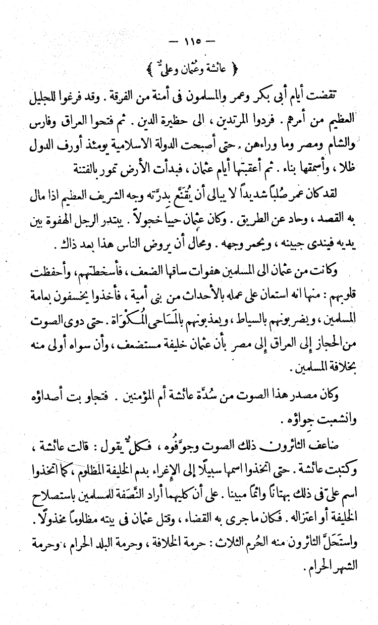 لقد كان عمر صُلباً شديداً لا يبالي أن يُقَنع بِدرَّته وجه الشريف العظيم إذا مال به القصد، وحاد عن الطريق. وكان عثمان حييا خجولا. يبتدر الرجل الهفوة بين يديه فيندي جبينه، ويحمرّ وجهه. ومحال يروض الناس هذا بعد ذاك.