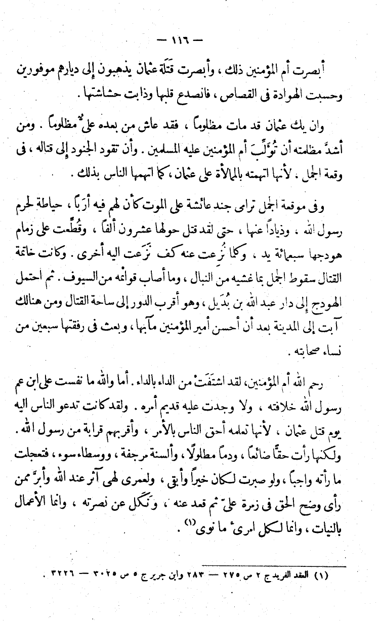 رحم الله أم المؤمنين، لقد اشتَفَت من الداء بالداء. أما والله ما نفست على ابن عم ورسول الله خلافته، ولا وجدت عليه قديم أمره. لقد كانت تدعو الناس إليه يوم قتل عثمان، لأنها تعلمه أحق الناس بالأمر، وأقربهم قرابة من رسول الله. ولكنها رأت حقاًّ ضائعاً، ودماً مطولا، وألسنة مرجفة، ووسطاء سوء، فتعجلت ما رأته واجبا، ولو صبرت لكان خيراً وأبقى، ولعمري لهي آثر عند الله وأبرَّ ممن رأي وضح الحق في زمرة عليّ قعد عنه، ونَكَل عن نصرته، وإنما الأعمال بالنيات