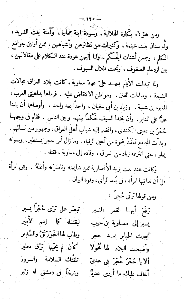ومن هؤلاء بكارة الهلالية، وسدودة ابنة عمارة، وآمنة بنت الشريد، وأم سنان بنت خيثمة، وكثيرات من نظائهرهن وأشباههن، ممن أوتين جوامع الكلم، وجمعن أشتات الحكم ولنا إليهن عودة عند الكلام على مقالاتهن، بين ازدحام الصفوف، وتحت ظلال السيوف.