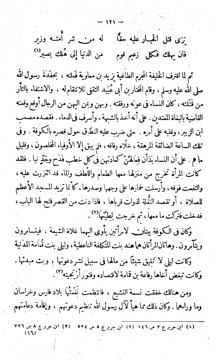 ثم لما اقترف الخليفة المجرم الطاغية يزيد بن معاوية فعلته، بحفدة رسول الله صلى الله عليه وسلم، وقام المختار بن أبي عبيدة الثقفي للانتقام له، والاشتفاء من قَتَلته، كان النساء في عونه ورفقته. وبهن وبمن إليهن من الرجال أوقع القاضية بالبغاة المعتدين على أنه أخذ بالشبهة، وأسرف في الدماء. فقصده مصعب بن الزبير، وغلبه على أمره. حتى ضرب عليه النطاق حول قصره بالكوفة. وفي تلك الساعة الضائقة المرهقة، خلاه رفاقه، فلم يبقى إلا الأوفياء المخلصون، وقليل ما هم، على أن النساء بَدَ أ، فعالهن كعادتهن في كل خطب فدح وجدٍ نبا. فلقد كانت المرأة تخرج من منزلها معها الطعام واللّطف والماء قد ائتزرت عليه،