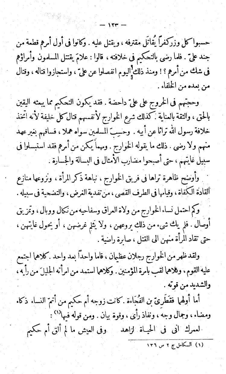 وأوضح ظاهرة تراها في فريق الخوارج نباهة المرأة، ونزوعها منازع القادة الكفاءة، وقيامها في الطرف القصي من تفدية الغرض، والتضحية في سبيله.