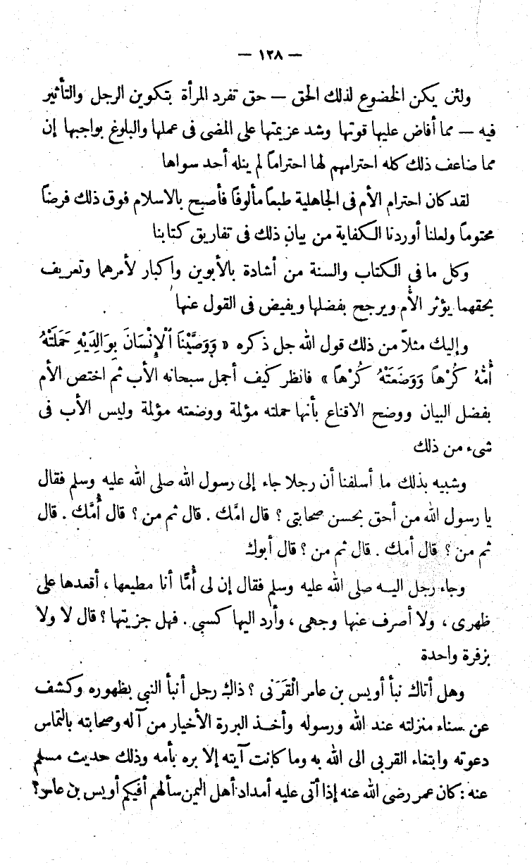 لقد كان احترام الأم في الجاهلية طبعاً مألوفاً فأصبح بالإسلام فوق ذلك فرضاً يؤثر الأم ويرجع بفضلها في القول عنها.