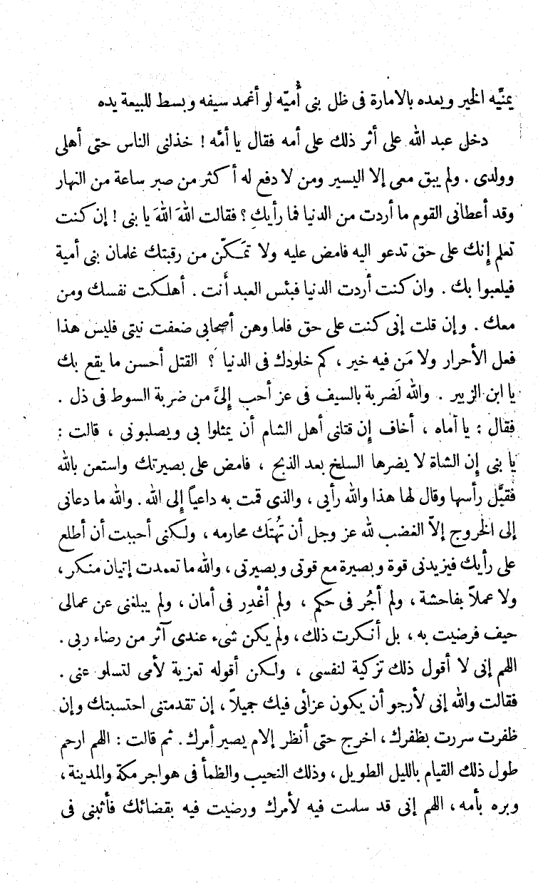 دخل عبد الله على أثر ذلك على أمه فقال يا أمه! خذلني الناس حتى أهلي وولدي، ولم يبقى معي إلا اليسير ومن لا دفع له أكثر من صبر ساعة من النهار وقد أعطاني القوم ما أردت من الدنيا فما رأيك؟ فقالت: الله الله يا بني! إن كنت تعلم أنك على حق تدعو إليه غامض عليه ولا تمكن من رقبتك غلمان بني أمية فيلعبوا بك. وإن كنت أردت الدنيا فبئس العبد أنت. أهلكت نفسك ومن معك. وإن إني كنت على حق فلما وهن أصحابي ضعفت نيتي فليس فعل الأحرار ولا من فيه خير، كم خلودك في الدنيا؟ القتل أحسن ما يقع بك يا ابن الزبير. والله لضربة بالسيف في عز أحب إلى من ضربة السوط في ذل. فقال: يا أماه، أخاف إن قتلني أهل الشام أن يمثلوا بي ويصلبوني، قالت يا بني إن الشاة لا يضرها السلخ بعد الذبح، فامض على بصيرتك واستعن بالله فقبل رأسها وقال لها هذا والله رأيي، والذي قمت به داعياً إلى الله والله ما دعاني إلى الخروج إلا الغضب لله عز وجل أن تهتك محارمه، ولكني أحببت أن اطلع على رأيك فيزيدني قوة وبصيرة مع قوتي وبصيرتي، والله ما تعمدت إتيان منكر، ولا عملا بفاحشة، ولم أجر في حكم، ولم أغدر في أمان، ولم يبلغني عن عمالي حيف فرضيت به، بل أنكرت ذلك، ولم يكن شيء عندي آثر من رضاء ربي، اللهم إني لا أقول ذلك تزكية لنفسي، ولكن أقوله تعزية لأمي لتسلو عني. فقالت والله إني لأرجو أن يكون