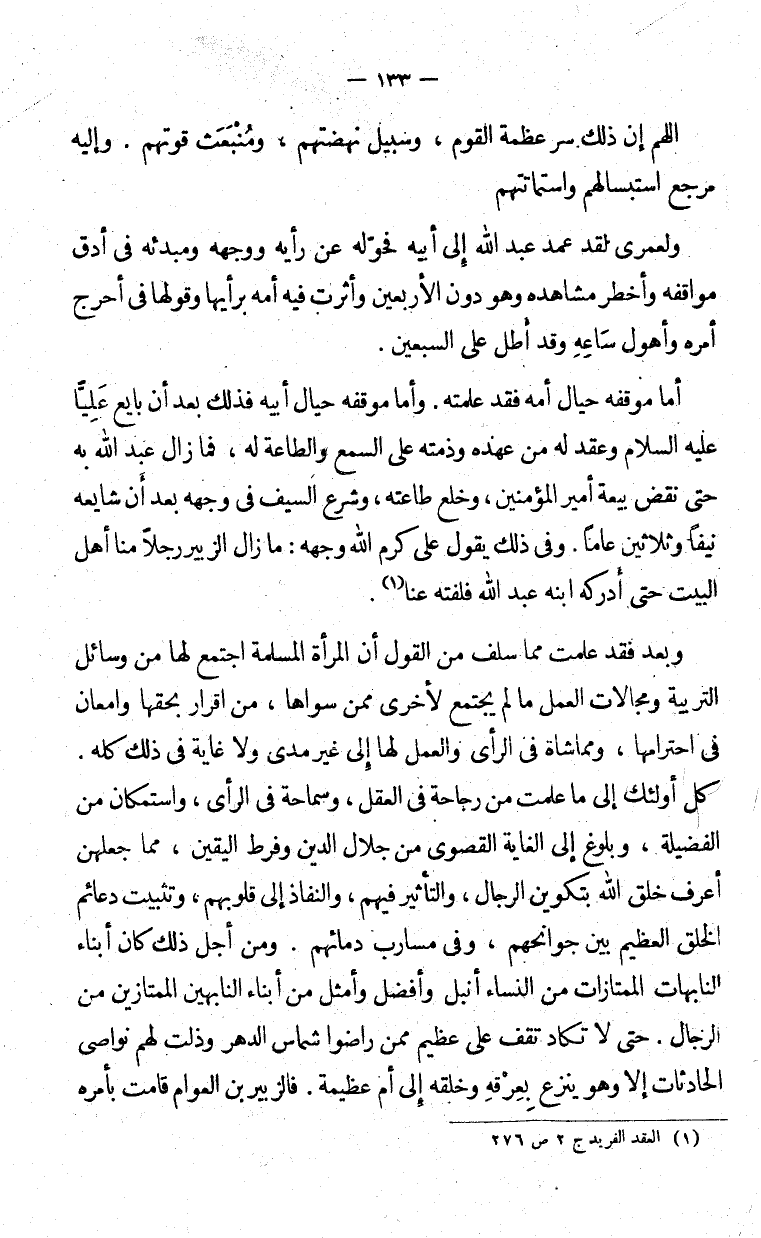 وبعد فقد علمت مما سلف أن المرأة المسلمة اجتمع لها من وسائل التربية ومجالات العمل ما لم يجتمع لأخرى ممن سواها، من إقرار بحقها وإمعان في احترامها وما شاة في الرأي والعمل لها إلى غير مدى ولا غاية في ذلك كله كل أولئك إلى ما علمت من رجاحة في العقل، وسماحة في الرأي واستمكان من الفضية، وبلوغ إلى الغاية القصوى من جلال الدين وفرط اليقين، مما جعلهن أعرف خلق الله بتكوين الرجال، والتأثير فيهم، والنفاذ إلى قلوبهم، وتثبيت دعائم الخلق العظيم بين جوانحهم، وفي مسارب دمائهم. ومن أجل ذلك كان أبناء النابهات الممتازات من النساء أنبل وأفضل وأمثل منم أبناء النابهين الممتازين من الرجال. حتى لا تكاد تقف على عظيم ممن راضوا أشماس الدهر وذلت لهن نواصي الحادثات إلا وهو ينزع بِعِرْقة إلى أم عظيمة. فالزبير بن العوّام قامت بأمره