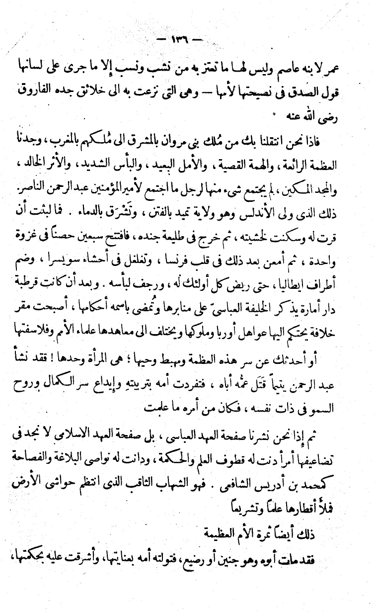 حصناً في غزوة واحدة، ثم أمعن بعد ذلك في فرنسا، وتغلغل في أحشاء سويسرا، وضم أطراف إيطاليا، حتى ريض كل أولئك له؛ ورجف لبأسه، وبعد أن كانت قرطبة إمارة يذكر الخليفة العباسي على منابرها وتُمضي باسمه أحكامها، أصبحت مقرّ خلافة يحتكم إليها عواهل أوربا وملوكها يختلف إلى معاهدها علماءُ الأمم وفلاسفتها.