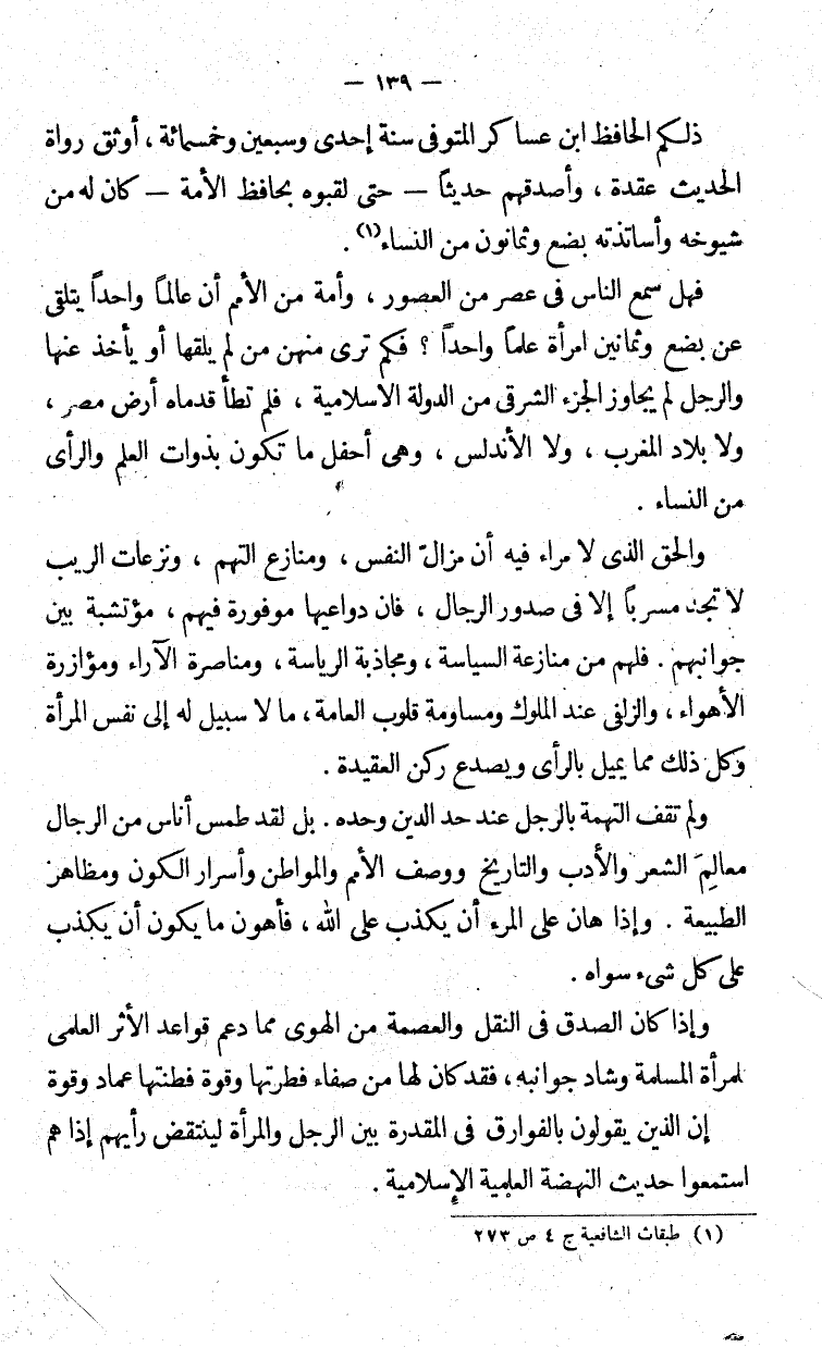 فهل سمع الناس في عصر من العصور، وأمة من الأمم أن عالماً واحداً يتلقى عن بضع وثمانين امرأة علماً واحدا؟ فكم ترى منهن من لم يلقها أو يأخذ عنها والرجل لم يجاوز الجزء الشرقي من الدولة الإسلامية، فلم تطأ أرض مصر، ولا بلاد المغرب، ولا الأندلس، وهي أحفل ما تكون بذوات العلم والرأي من النساء.