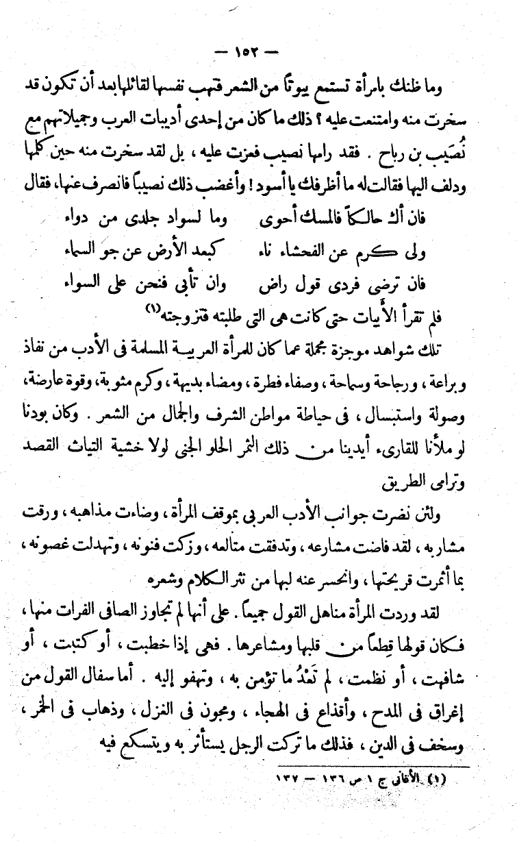 ولئن نضرت جوانب الأدب العربي بموقف المرأة، وضاءت مذاهبه، ورقت مشاربه، لقد فاضت مشارعه، وتدفقت متالعه، وزكت فنونه، وتهدلت غصونه، بما أثمرت قريحتها، وانحسر عنه لبها من نثر الكلام وشعره.