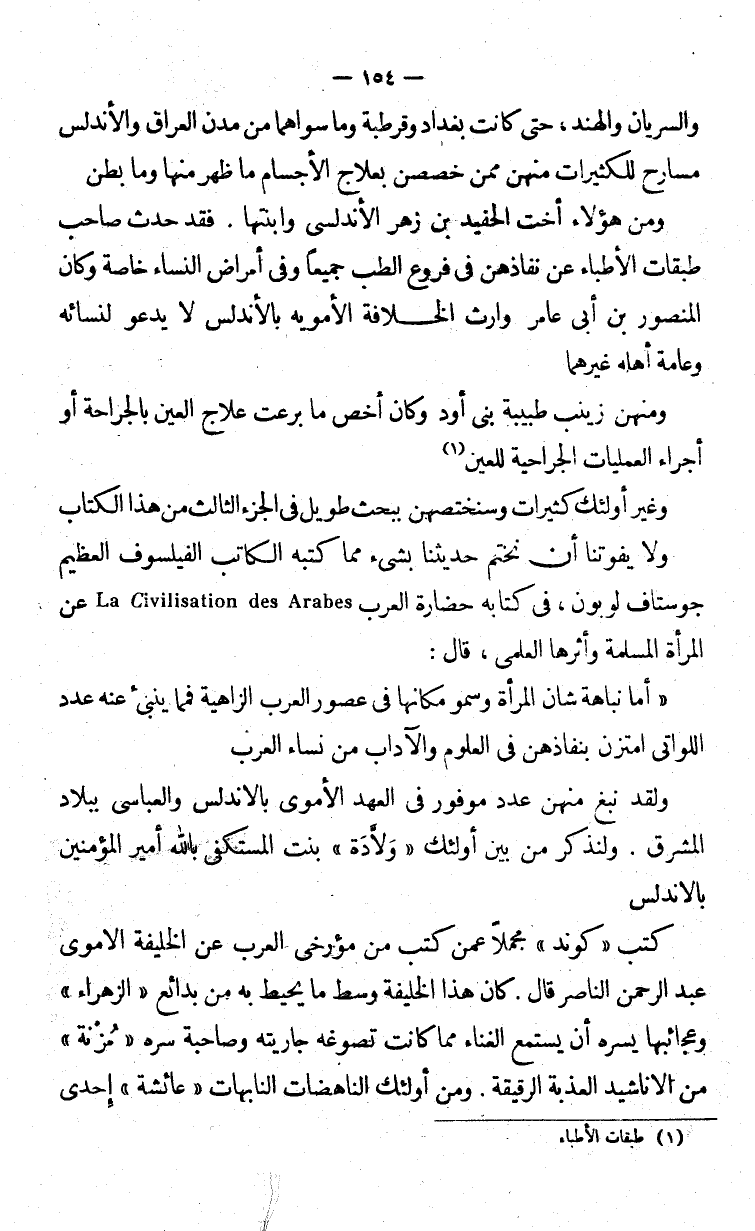 وغير أولئك كثيرات وسنختصهن ببحث طويل في الجزء الثالث من هذا الكتاب. ولا يفوتنا أن نختم حديثنا بشيء مما كتبه الكاتب الفيلسوف العظيم جوستاف لوبون في كتابه حضارة عن المرأة المسلمة وأثرها العلمي، قال: