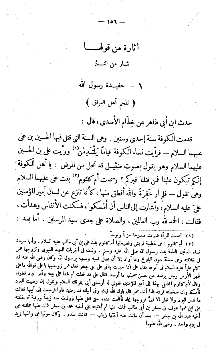 قدمت الكوفة سنة إحدى وستين. وهي السنة التي قتل فيها الحسين بن علي عليهما السلام فرأيت نساء الكوفة قياماً يَلتدِمن ورأيت علي بن الحسين عليهما السلام وهو يقول بصوت ضئيل قد نحل من المرض: يا أهل الكوفة إنكم تبكون علينا فمن قتلنا غيركم، وسمعت أم كلثوم بنت علي عليهما السلام وهي تقول فلم أر خَفِرةً والله أنطق منها، كأنما تنزع عن لسان أمير المؤمنين عليّ عليه السلام، وأشارت إلى الناس أن أمسكوا، فسكنت الأنفاس وهدأت، فقالت الحمد الله رب العالمين، والصلاة على جدّي سيد المرسلين. أما بعد: