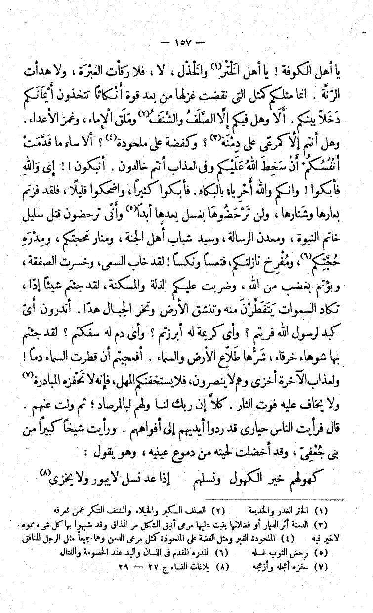 يا أهل الكوفة! يا أهل الختر والْخَذْل، لا، فلا رَقأت العَبرة، ولا هدأت الرّنَّة. إنما مثلكم كمثل التي نقضت غزلها من بعد قوة أنكاثاً تتخذون أيمانكم دخلاً بينكم. ألا وهل فيكم إلا الصلف والشنف ومَلَق الإمام، وغمر الأعداء. وهل أنتم إلا كمرعىً على دِمنه؟ وكفضة على ملحودة؟ ألا ساءَ ما قَدمت أنفسكم أن سخط الله عليكم وفي العذاب أنتم خالدون. أتبكون!! إي والله فابكوا! وإنكم والله أحرياءُ بالبكاء. فابكوا كثيراً، واضحكوا قليلا، فلقد فزتم بعارها وشنارها، ولن ترحضوها بغسل بعدها أبداً وأني ترحضون قتل سليل خاتم النبوة، ومعدن الرسالة. وسيد شباب أهل الجنة، ومنار محجتكم، ومدرة حُجتكم ومُفرح نازتكم، فتعساً ونكساً! لقد خاب السعي، وخسرت الصفقة، وبؤتم بغضب من الله، وضربت عليكم الذلة والمسكنة، لقد جئتم شيئاً إدّا، تكاد السموات يتفطرن منه وتنشق الأرض وتخر الجبال هدّا. أتدرون أي كبد لرسول الله فريتم؟ وأي كريمة له أبرزتم؟ وأي دم له سفكتم؟ لقد جئتم بها شوهاء خرقاء شَرها طلاع