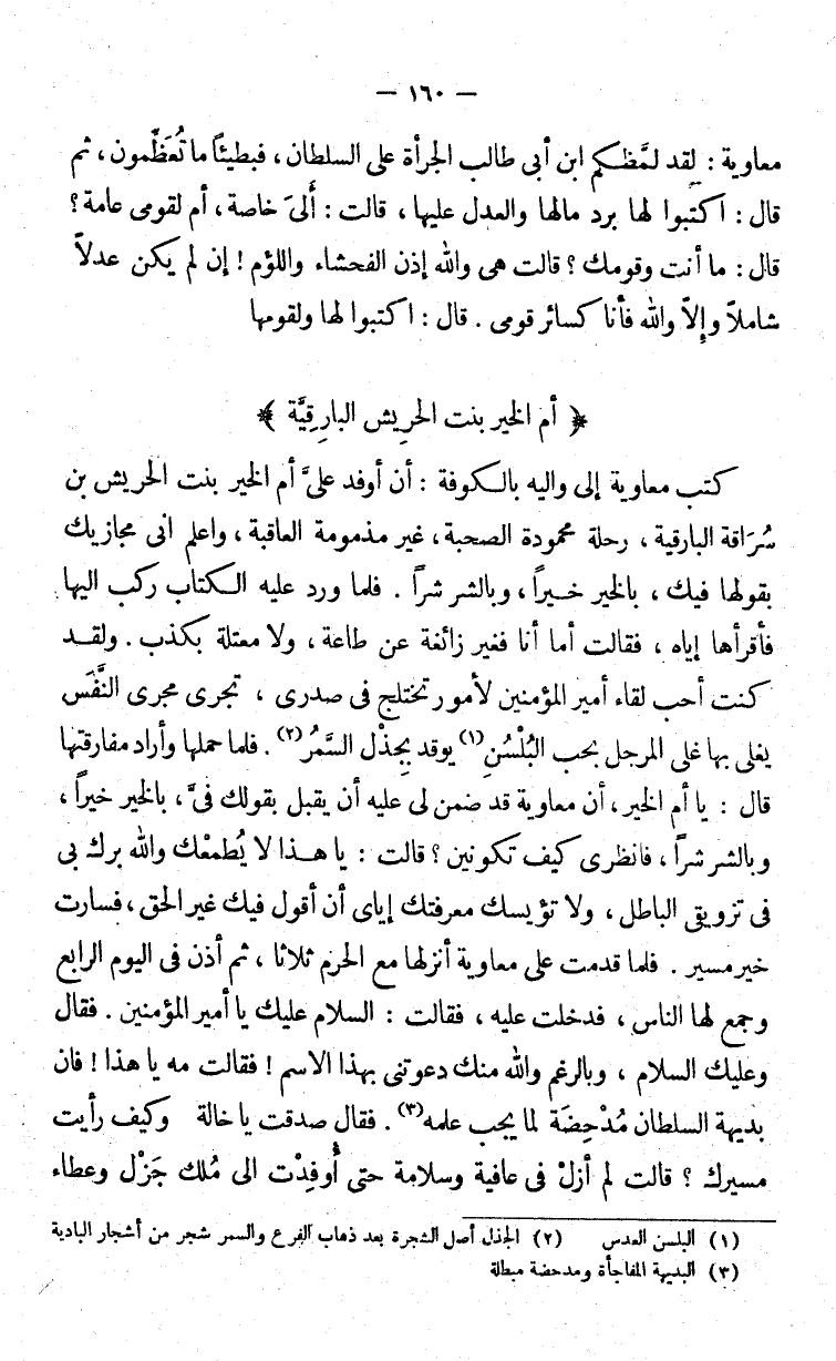 معاوية: لقد لمَّظكم ابن أبي طالب الجرأة على السلطان. فبطيئاً ما تُعَظمون ثم قال: اكتبوا لها برد مالها والعدل عليها، قالت: ألي خاصة، أم لقومي عامة؟ قال ما أنت وقومك؟ قالت هي والله إذن الفحشاء إذن الفحشاء واللؤم! إن لم يكن عدلا شاملا وإلا والله فأنا كسائر قومي. قال: اكتبوا لها ولقومها.