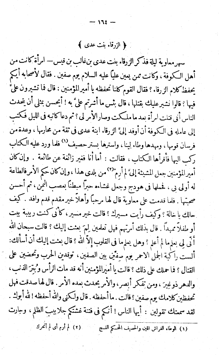 سهر معاوية ليلة فذكر الزرقاء بنت عدي غالب بن قيس - امرأة كانت من أهل الكوفة. وكانت ممن يعين عليا عليه السلام يوم صفيف. فقال لأصحابه أيكم يحفظ كلام الزرقاء؟ فقال القوم كلنا تحفظه يا أمير المؤمنين: قال فما تشيرون عليّ فيها؟ قالوا نشير عليك بقتلها، قال بئس ما أشرتم على به! أيحسن بمثلي أن يتحدث الناس أني قتلت امرأة بعد ما ملكت وصار الأمر لي؟ ثم دعا كاتبه في الليل فكتب إلى عامله في الكوفة أن أوفد إلىّ الزرقاء ابنة عدي في ثقة من محارمها. وعدة من فرسان قومها، ومهدها وطاءلين، وأسترها بستر حصيف فلما ورد عليه الكتاب ركب إليها فأقرأها الكتاب، فقالت: أما أنا فغير زائغة عن طائفة، وإن كان أمير المؤمنين جعل المشيئة إلى لم أرم منم بلدي هذا، وإن كان حكم الأمر فالطاعة له أولى بي، فحملها في هودج وجعل غشاءه حبراً مبطنا بعصب اليمن، ثم أحسن صحبتها. فحملها في هودج وجعل غشاءه حبراً مبطنا بعصب اليمن، ثم أحسن صحبتها. فلما قدمت على معاوية قال لها مرحباً وأهلا خير مقدم قدم وافد. كيف حالك يا خالة؟ وكيف رأيت مسيرك؟ قال خير مسير، كأني كنت ربيبة بيت أو طفلا ممهداً. قال بذلك أمرتهم فهل تعلمين لِمَ بعثت إليك؟ قال سبحانه أني لي بعلم ما لم أعلم؟ وهل يعلم ما في القلوب إلا الله؟ قال بعثت إليك أن أسألك: ألست راكبة الجمل الأحمر يوم صفين بين صفين، توقدين الحرب