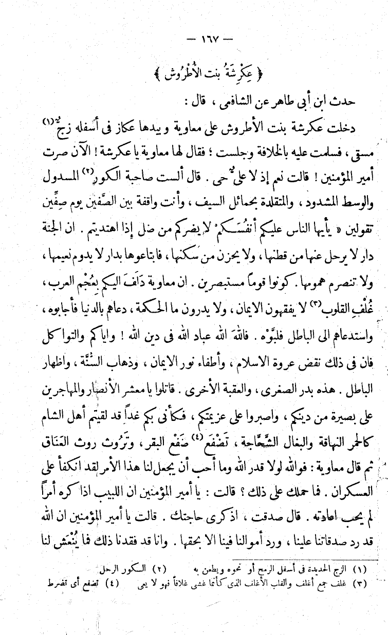 دخلت عكرشة بنت الأطروش على معاوية وبيدها عكاز في أسفله زجٌ مسقي فسلمت عليه بالخلافة وجلست؛ فقال لها معاوية يا عكرشة! الآن صرت أمير المؤمنين قالت: نعم إذ لا عليٌ حي، قال الست صاحبة الكور المسدول والوسط المشدود والمتقلدة بحمائل السيف، وأنت واقفة بين الصفين يوم صفين تقولين: يا أيها الناس عليكم أنفُسكم لا يضركم من ضل إذا اهتديتم. إن الجنة دار لا يرحل عنها من قطنها، ولا يحزن من سكنها، فابتاعوها بدار لا يدوم نعيمها ولا تنصرهم همومها. كونوا قوم مستبصرين. إن معاوية دَلَفَ إليكم بِعجم العرب غُلف القلوب لا يفقهون الإيمان، ولا يدرون ما الحكمة، دعاهم بالدنيا فأجابوه، واستدعاهم إلى البطل فلبّوه. فالله الله عباد الله في دين الله! وإياكم والتوكل فإن في ذلك نقض عروة الإسلام، وإطفاء نور الإيمان، وذهاب السُّنّة، وإظهار الباطل. هذه بدر الصغرى، والعقبة الأخرى. قاتلوا يا معشر الأنصار والمهاجرين على بصيرة من دينكم، واصبروا على عزيمتكم، فكأني بكم غداً قد لقيتم أهل الشام كالحمر النهاقة والبغال الشحاجة، تضْفَع ضفع البقر، وتَروث روث العَنَاق، ثم قال معاوية فوالله لولا قدر الله وما أحب أن يجعل لنا هذا الأمر لقد انكفأ على العسطران. فما حملك على ذلك؟ قالت. يا أمير المؤمنين إن اللبيب إذا كره أمراً لم يحب إعادته. قال: صدقت، اذكري حاجتك. قالت: يا أمير المؤمنين إن الله قد ردّ صدقاتنا علينا، وردّ أموالنا فينا إلا بحقها، وإنا قد فقدنا ذلك فما يُنْعَش لنا
