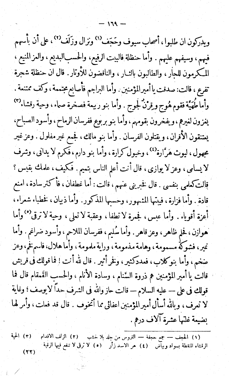 وعز لا يوازي، قال: أنت أعلم الناس بتميم. فكيف، علمك بقيس؟ قالت كعلمي بنفسي. قال فخبرني عنهم، قالت: أما غطفان، فأكثر سادة، وأمنع قادة. وأما فزارة، فبيتها المشهور وحسبها المذكور. وأمّا ذبيان فخطباء شعراء، أعزة أقوياء. وأما عبس، فجمرة لا تطفأ، وعقبة لا تعلى، وحية لا ترقى وأمّا هوازن، فحلم ظاهر، وعز قاهر. وأمّا سليم، ففرسان الملاحم، واسود ضراغم، وعز ضخم، وأمّا بنو كلاب، فعدد كثير، وفخر أثير. قال الله أنت! فما قولك في قريش، قالت يا أمير المؤمنين هم ذروة السنام، وسادة الأنام، والحسب القمقام قال فما قولك في علي - عليه السلام - قالت حاز والله في الشرف حدّاً لا يوصف، وغاية لا تعرف، وبالله أسأل أمير المؤمنين إعفائي مما أتخوف. قال قد فعلت، وأمر لها بضيعة غلتها عشرة آلاف درهم.