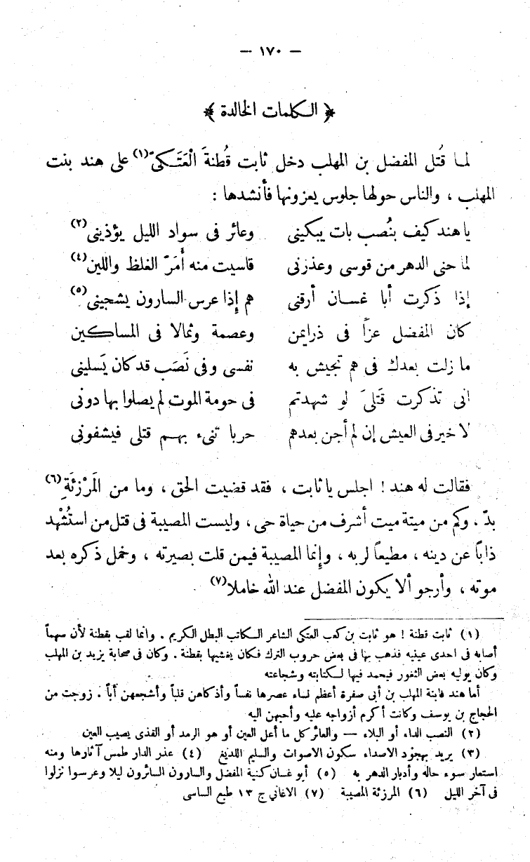 لما قُتل المفضل بن المهلب دخل ثابت قُطَنة العَتَكيّ على هند بنت المهلب، والناس حولها جلوس يعزونها فأنشدها: