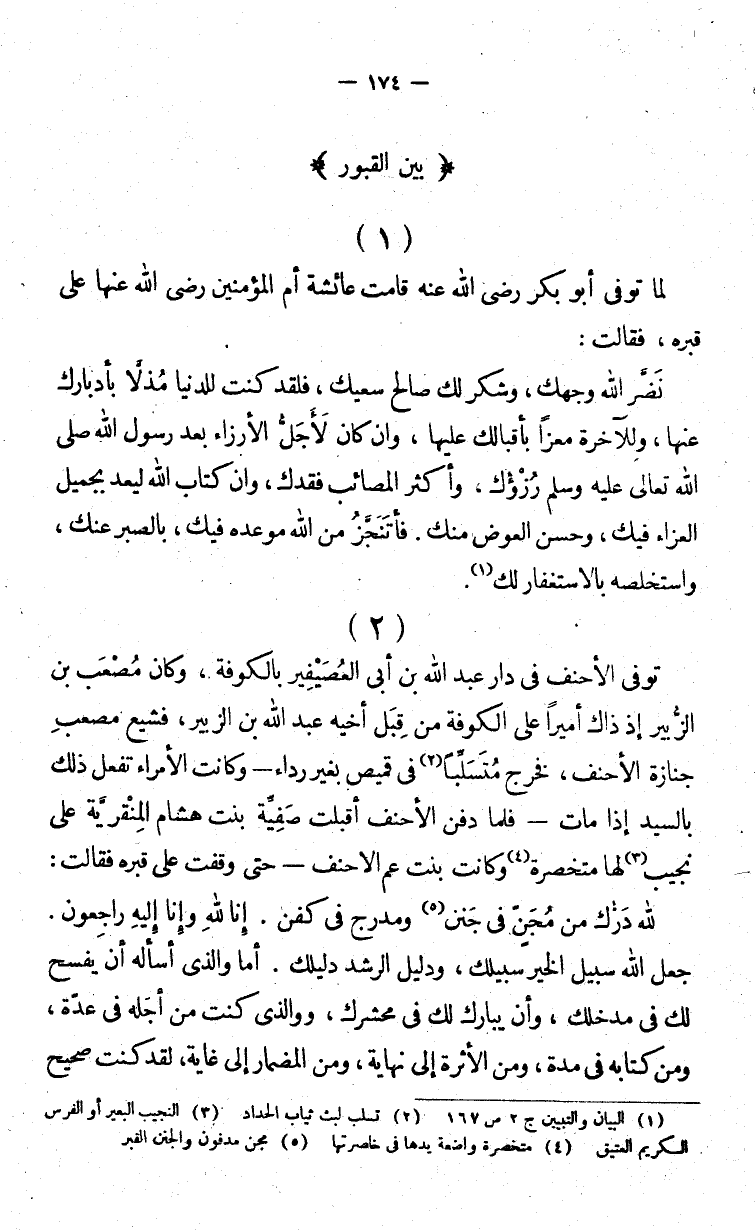 نَضَّر الله وجهك، وشكر لك صالح سعيك، فلقد كنت للدنيا مُذلاًّّ بإدبارك عنها، وللآخرة معزا بإقبالك عليها، وإن كان لأَجَل الأرزاء بعد رسول الله صلى الله تعالى عليه وسلم رُزْؤُك، واكثر المصائب فقدك، وإن كتاب الله ليعد بجميل العزاء فيك، وحسن العوض منك فأَتنجَّزُ من الله فيك، بالصبر عنك، وأستخلصه بالاستغفار لك.