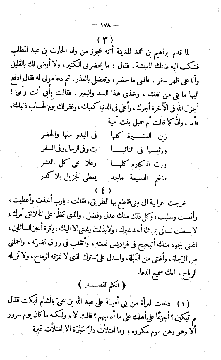 لما قدم إبراهيم بن محمد المدينة أتته عجوز من ولد الحارث بن عبد المطلب فشكت إليه ضنك العيش، فقال: ما يحضني الكثير، ولا أرضى لك بالقليل وأنا على ظهر سفر، فاقبلي ما حضر، وتفضلي بالعذر. ثم دعا مولى له فقال ادفع إليها ما بقي من نفقتنا وخذي هذا العبد والبعير. فقالت بأبي وأمي! أجزل الله في الآخرة أجرك وأعلى في الدنيا كعبك، وغفر لك يوم الحساب ذنبك، فأنت والله كما قالت أم جميل بنت أمية: