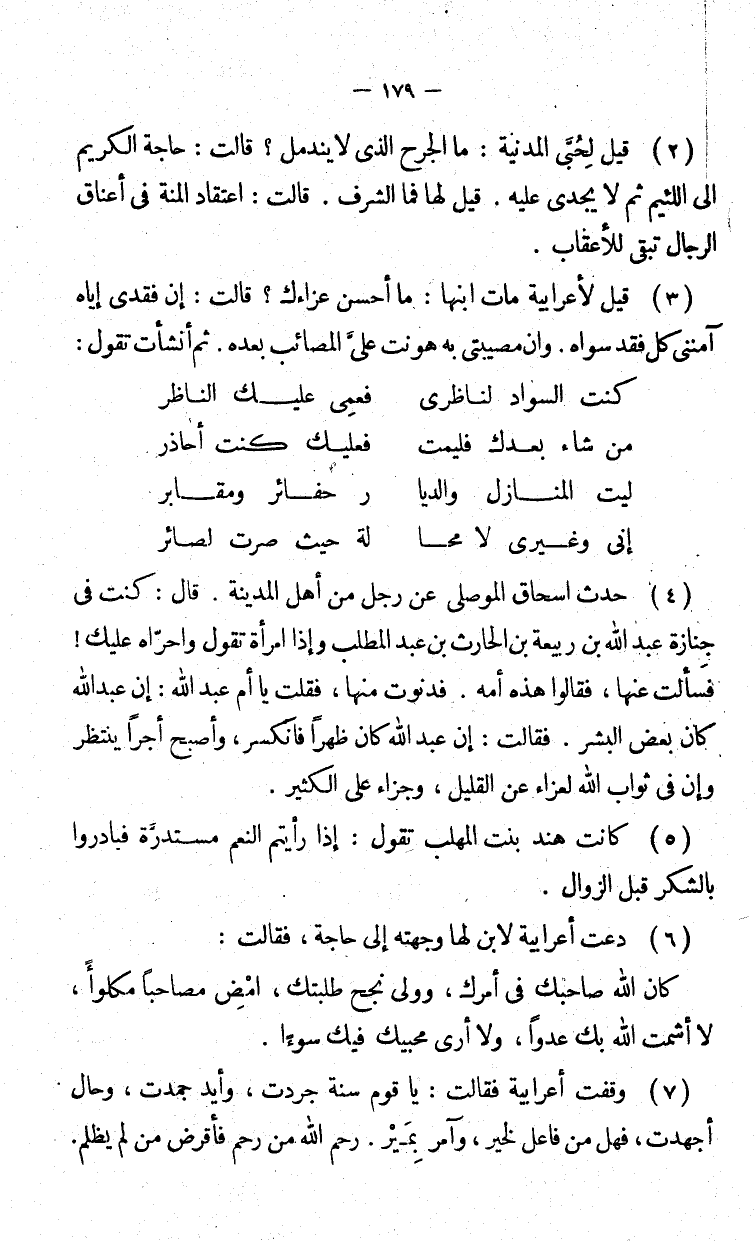 قيل لأعرابية مات ابنها: ما أحسن عزاءك؟ قالت: إن فقدي إياه آمنني كل فقد سواه. وإن مصيبتي به هّونت علىّ المصائب من بعده. ثم أنشأت تقول: